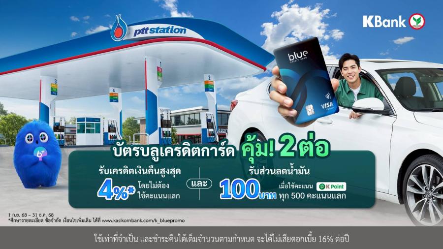 • คะแนนสะสม K Point ทุก 500 คะแนน แลกส่วนลดค่าน้ำมัน 100 บาทที่ สถานีบริการ พีทีที สเตชัน