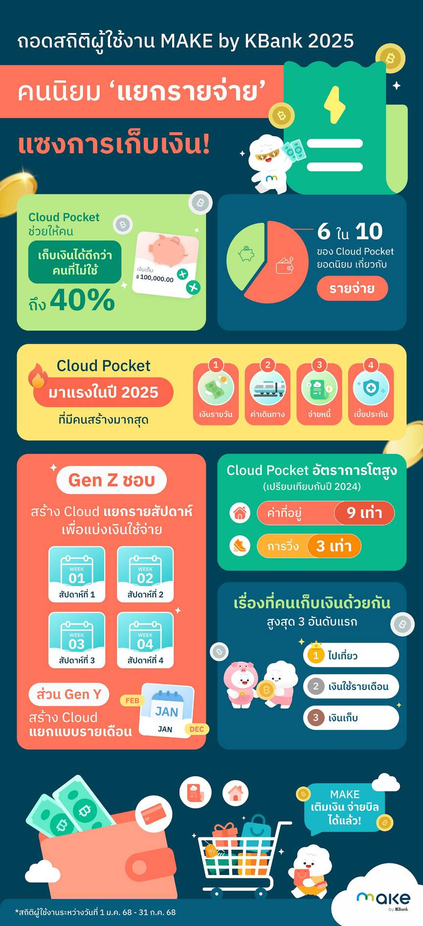 จากข้อมูลการใช้งานแอปพลิเคชัน MAKE by KBank พบว่าประเภท Cloud Pocket หรือ “กระเป๋าย่อย” ที่ได้รับความนิยมสูงสุดในปีนี้ ได้แก่ “เงินใช้รายวัน/สัปดาห์/เดือน” “เงินค่าการเดินทาง” “เงินเพื่อจ่ายหนี้” และ “ค่าเบี้ยประกัน” แทนที่ประเภท “เงินเก็บ” ซึ่งเคยเป็น Cloud Pocket ประเภทยอดนิยมในปี 2567 โดย 6 ใน 10 ของ Cloud Pocket ที่ถูกสร้างขึ้นจะเกี่ยวกับ “รายจ่าย” เช่น ค่าอาหาร ค่าน้ำ และค่าไฟ ส่วน Cloud Pocket ที่มีการเติบโตอย่างก้าวกระโดดเมื่อเทียบกับปีที่ผ่านมา ได้แก่ หมวดค่าที่อยู่อาศัย ที่มีการสร้างเพิ่มขึ้นถึง 9 เท่า และหมวดเกี่ยวกับกิจกรรมวิ่ง เช่น “รองเท้า” หรือ “มาราธอน” ที่โตขึ้นกว่า 3 เท่า ซึ่งการแบ่งเงินก่อนใช้ด้วย Cloud Pocket ไม่เพียงแต่ช่วยให้ผู้ใช้ควบคุมรายจ่ายได้ดีขึ้น แต่ยังมีผลต่อการออมโดยตรง ผู้ใช้สามารถสร้างกระเป๋าเงินแยกได้ไม่จำกัดตามเป้าหมายได้อย่างอิสระ ไม่ว่าจะแบ่งเก็บออม หรือแบ่งใช้ตามค่าใช้จ่ายที่มี จากสถิติสะท้อนว่า ผู้ที่ใช้ Cloud Pocket สามารถเก็บเงินได้มากกว่าผู้ที่ไม่มี Cloud Pocket ถึง 40% โดยกลุ่ม Gen Z นิยมแบ่งเงินแบบรายสัปดาห์ ขณะที่ Gen Y เลือกจัดการแบบรายเดือน