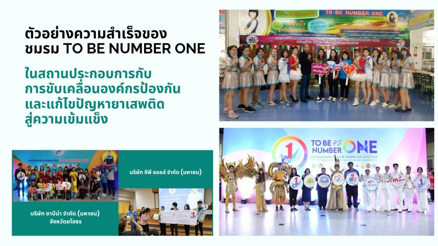 ดังมีตัวอย่างความสำเร็จของชมรม TO BE NUMBER ONE ในสถานประกอบการที่ดำเนินภารกิจด้านการป้องกันและแก้ไขปัญยาเสพติด ซึ่งได้น้อมนำแนวพระราชดำริของทูลกระหม่อมหญิงอุบลรัตนราชกัญญา สิริวัฒนาพรรณวดี องค์ประธานโครงการ TO BE NUMBER ONE มายึดถือปฏิบัติเพื่อพัฒนาบุคลากรในหน่วยงานและองค์กรให้ห่างไกลยาเสพติด เช่น…