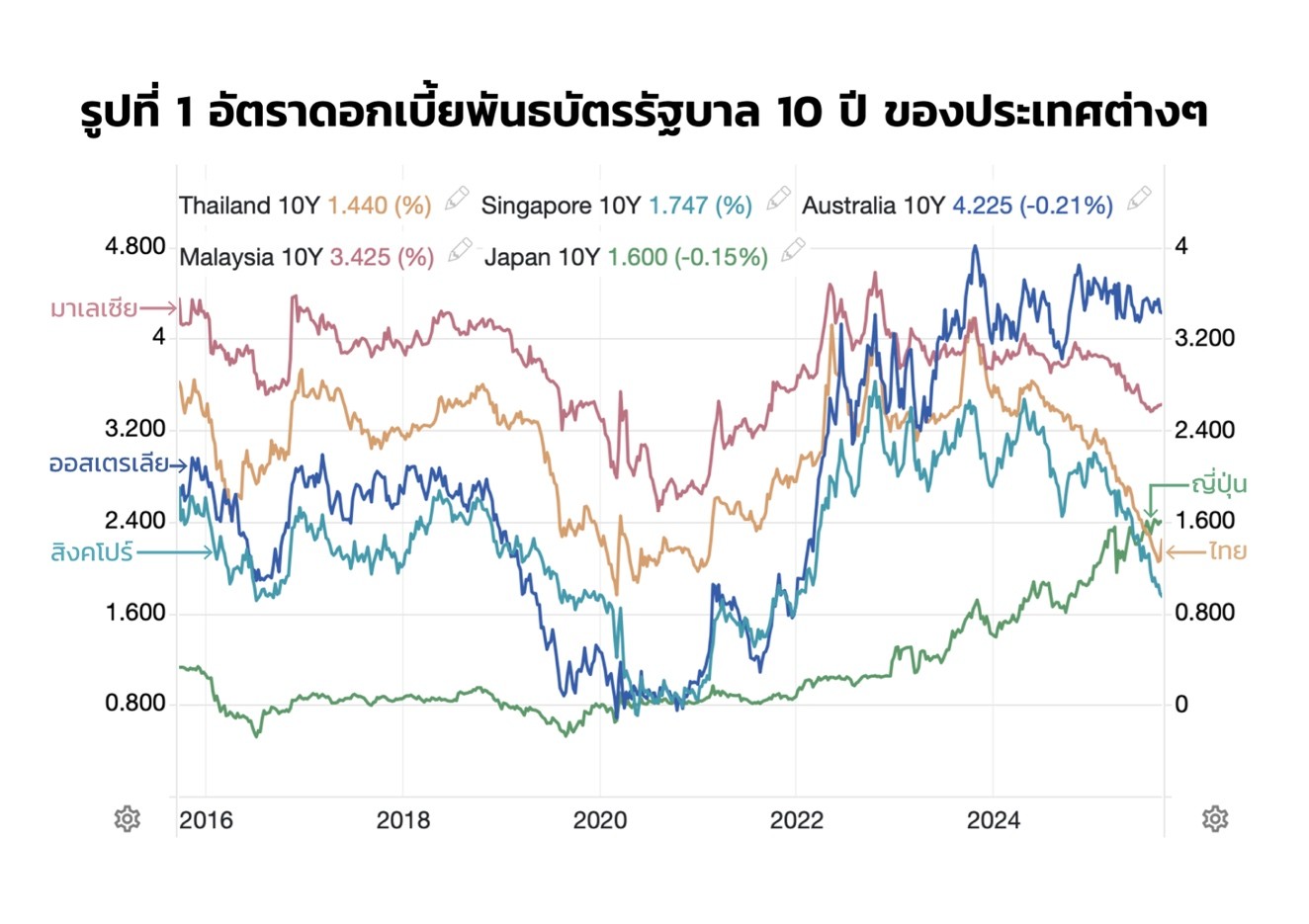 ถ้าหากเปรียบเทียบอัตราดอกเบี้ยพันธบัตรรัฐบาล 10 ปี ของประเทศสำคัญ ๆ กับของไทยแล้ว จะได้ผลตามที่เห็นดังรูปที่ 1 ณ ปัจจุบัน ออสเตรเลียสูงสุด ตามด้วยมาเลเซีย สิงคโปร์ และแม้กระทั่งญี่ปุ่น ต่างก็มีอัตราดอกเบี้ยสูงกว่าไทย