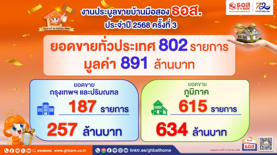 ธนาคารอาคารสงเคราะห์ (ธอส.) รายงานผลการจัดงาน ประมูลขายบ้านมือสอง ธอส. ประจำปี 2568 ครั้งที่ 3 เมื่อวันเสาร์ที่ 20 กันยายน 2568 ระหว่างเวลา 10.00 – 16.00 น. ได้รับความสนใจจากลูกค้าเป็นจำนวนมาก ทำให้สามารถจำหน่ายบ้านมือสองได้สูงถึง 802 รายการ มูลค่ารวม 891 ล้านบาท โดยเป็นทรัพย์ที่ตั้งอยู่ในพื้นที่กรุงเทพ ฯ และปริมณฑลจำนวน 187 รายการ รวมมูลค่า 257 ล้านบาท และทรัพย์ในเขตภูมิภาคจำนวน 615 รายการ รวมมูลค่า