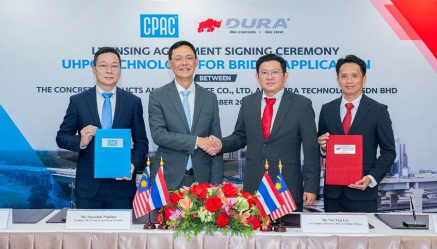 ธุรกิจเอสซีจี ซีเมนต์แอนด์กรีนโซลูชันส์ โดย บริษัท ผลิตภัณฑ์และวัตถุก่อสร้าง จำกัด (CPAC) ในเครือ SCG และ DURA TECHNOLOGY SDN BHD บริษัทผู้เชี่ยวชาญงานออกแบบ ผลิตและติดตั้งคานสะพานคอนกรีตสมรรถนะสูงพิเศษ (UHPC BRIDGE GIRDER) สำหรับงานก่อสร้างและซ่อมแซมโครงสร้างสะพานชั้นนำระดับโลก ร่วมลงนามสัญญาอนุญาตใช้สิทธิเทคโนโลยี Ultra-High Performance Concrete (UHPC) คอนกรีตสมรรถนะสูงพิเศษ สำหรับการประยุกต์ใช้ในงานวิศวกรรมสะพานระดับสูง ที่มีความแข็งแรง ทนทาน อายุการใช้งานยาวนานมากขึ้น อีกทั้งสามารถช่วยให้บริหารงานโครงการก่อสร้างได้รวดเร็วขึ้น ลดค่าใช้จ่ายในการบำรุงรักษาระยะยาว พร้อมยกระดับมาตรฐานใหม่งานโครงสร้างสะพานและโครงสร้างพื้นฐานในประเทศ