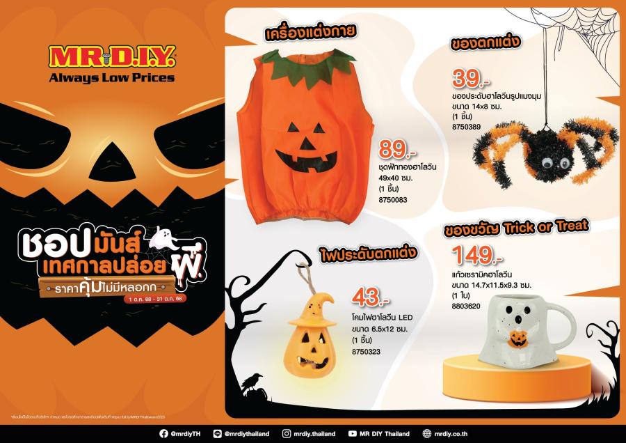 กรุงเทพฯ – 6 ตุลาคม 2568 – มิสเตอร์. ดี.ไอ.วาย. ผู้นำธุรกิจค้าปลีกอุปกรณ์ตกแต่งบ้านและสินค้าไลฟ์สไตล์ ต้อนรับเทศกาลฮาโลวีนกับแคมเปญ “ชอปมันส์เทศกาลปล่อยผี ราคาคุ้มไม่มีหลอก”(1) ที่ยกขบวนสินค้าธีมหลอนกว่า 130 รายการ ในราคาถูกคุ้มเสมอ (Always Low Prices) ครอบคลุมทั้งของตกแต่งบ้าน ไฟประดับตกแต่ง เครื่องแต่งกาย และของขวัญ Trick or Treat เพื่อให้ลูกค้าชาวไทยได้สนุกกับการชอปเติมเต็มสีสัน และสร้างบรรยากาศความหลอนในช่วงเทศกาลปล่อยผีได้อย่างเต็มที่ ตั้งแต่วันที่ 1 – 31 ตุลาคม 2568
