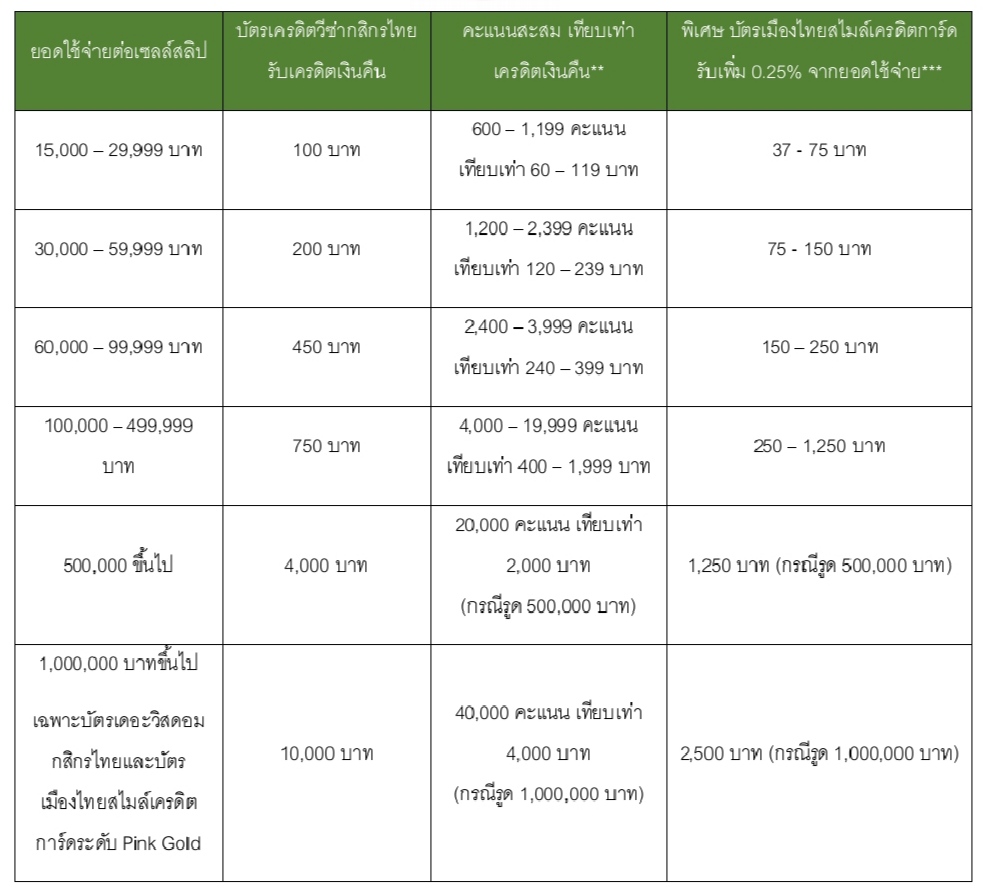 หมายเหตุ: จำกัดการรับเครดิตเงินคืนสูงสุด 10000 บาท/ท่าน ตลอดรายการ เฉพาะบัตร THE WISDOM กสิกรไทย และบัตรเมืองไทยสไมล์เครดิตการ์ดระดับ Pink Gold จึงจะสามารถรับเงินคืน 10000 บาทได้