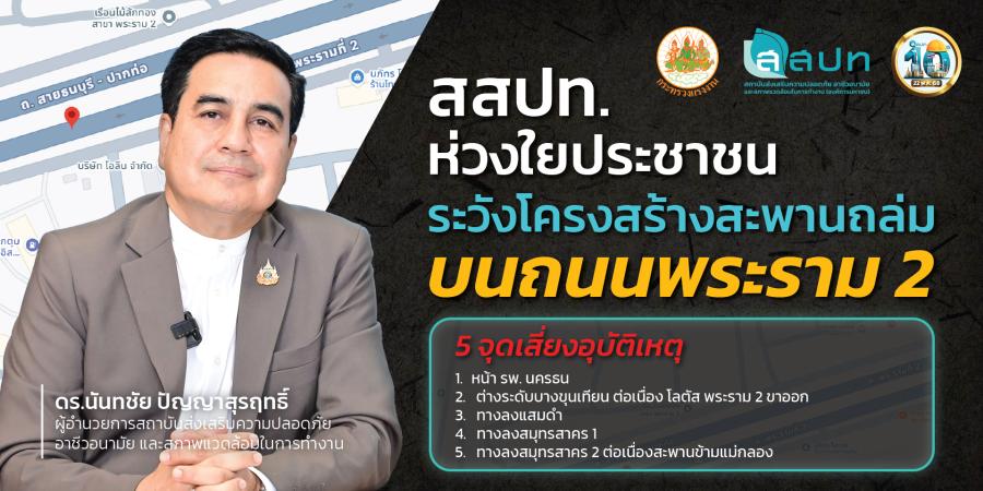 ดร.นันทชัย ปัญญาสุรฤทธิ์ ผอ.สถาบันส่งเสริมความปลอดภัย อาชีวอนามัยและสภาพแวดล้อมในการทำงานหรือ สสปท. แสดงความห่วงใยกรณีการเกิดอุบัติเหตุซ้ำๆบนถนนพระรามสอง ทั้งจากคานสะพานถล่ม ชิ้นส่วนโครงสร้างตกหล่น หรืออุบัติเหตุจากเครื่องจักรก่อสร้าง ซึ่งที่ผ่านมาหน่วยงานที่รับผิดชอบทั้งภาครัฐและผู้รับจ้างได้มีการออกมาตรการกำกับดูแลที่ครอบคลุม ตั้งแต่การตรวจสอบความปลอดภัยในทุกกิจกรรม การนำเทคโนโลยีมาใช้ในการติดตาม ไปจนถึงการกำหนดบทลงโทษที่ชัดเจน เพื่อให้มั่นใจว่าการก่อสร้างจะสามารถดำเนินการให้แล้วเสร็จตามแผนงาน โดยเฉพาะในช่วงที่กำลังจะมีการเชื่อมต่อกับสัญญาถัดไป ทั้งนี้ได้มีการเตือนและเฝ้าระวังการก่อสร้างให้ไม่ส่งผลกระทบหรือสร้างความสูญเสียต่อชีวิตและทรัพย์สินของประชาชน