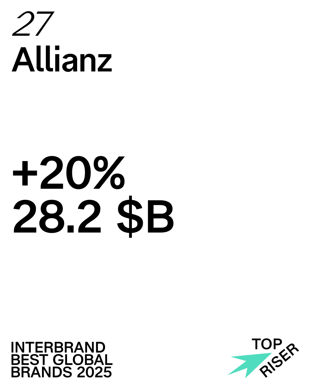 อลิอันซ์ ผู้นำด้านประกันภัยและการบริหารสินทรัพย์ระดับโลก ได้รับการจัดอันดับให้เป็น บริษัทประกันภัยอันดับ 1 ของโลก ต่อเนื่องเป็นปีที่ 7 จากการจัดอันดับ “Best Global Brands 2568” โดยบริษัทที่ปรึกษาชั้นนำ Interbrand โดยในปีนี้ อลิอันซ์ได้ขยับขึ้นมาอีก 2 อันดับ อยู่ที่อันดับ 27 จากแบรนด์องค์กรทั้งหมดทั่วโลก โดย 5 อันดับแรก ได้แก่ Apple Microsoft Amazon Google และ Samsung