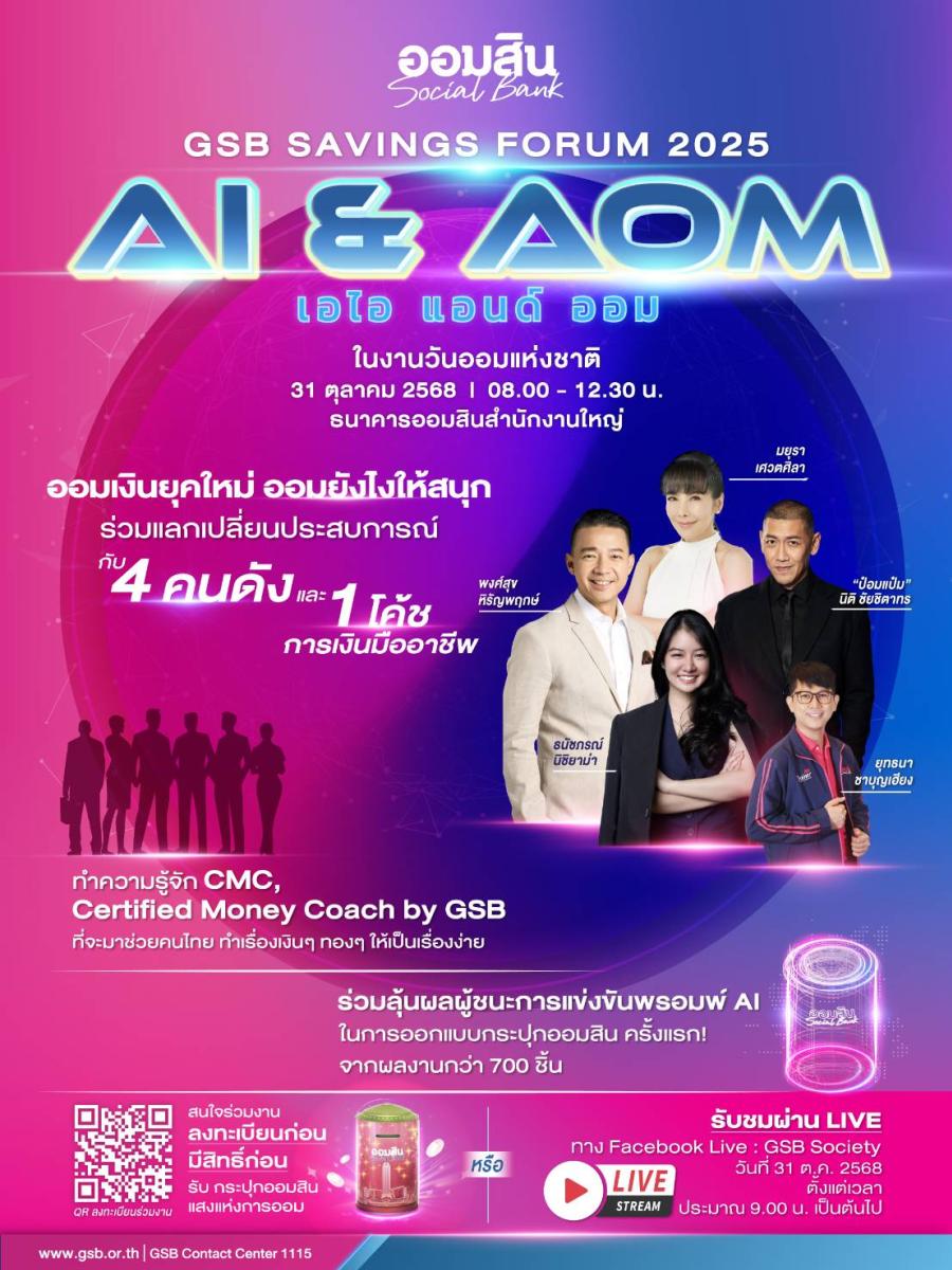 นางลภาวรรณ จันทร์กระจ่าง รองผู้อำนวยการธนาคารออมสิน รักษาการผู้อำนวยการธนาคารออมสิน เปิดเผยว่า ธนาคารออมสินในฐานะสถาบันการออมของคนไทย ตอกย้ำบทบาทผู้นำด้านการส่งเสริมการออมและให้ความรู้ทางการเงิน (Financial Literacy) กับประชาชนอย่างต่อเนื่อง โดยเฉพาะในยุคที่เทคโนโลยี AI เข้ามามีบทบาทสำคัญในชีวิตประจำวัน ธนาคารจึงถือโอกาสในการจัดงานวันออมแห่งชาติ วันที่ 31 ตุลาคม 2568 ยกระดับสู่ GSB SAVINGS FORUM 2025 ภายใต้แนวคิด “AI & AOM ออมยุคใหม่ สร้างสังคมไทยให้ยั่งยืน” เพื่อให้เป็นเวทีในการสื่อสารด้านการออมและจุดประกายการผสานพลังเทคโนโลยี “AI” (Artificial Intelligence) เข้ากับ “AOM” (การออม) อย่างสร้างสรรค์ผ่านกิจกรรมสำคัญ อาทิ มินิทอล์ก “ออมยุคใหม่ สร้างสังคมไทยให้ยั่งยืน” โดยกูรูและเซเลบริตี้ชื่อดัง การประกวดออกแบบ “กระปุกออมสินแห่งโลกยุคดิจิทัล” ด้วย AI รอบชิงชนะเลิศ ตลอดจนการเปิดตัว “โค้ชการเงินมืออาชีพ” หรือ CMC by GSB โดยงาน GSB SAVINGS FORUM 2025 ในครั้งนี้จัดขึ้นเป็นปีแรก และธนาคารตั้งเป้าจัดเป็นงานประจำทุกปีในวันออมแห่งชาติ เพื่อขับเคลื่อนภารกิจหลักของธนาคารในการให้ความรู้ทางการเงินและเป็นเวทีหลักด้านการส่งเสริมการออมแก่สังคมไทยอย่างต่อเนื่อง