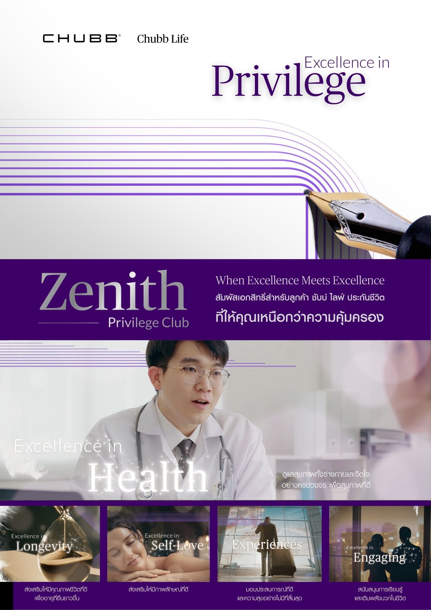 ชับบ์ ไลฟ์ ประกันชีวิต เปิดตัวโปรแกรมสิทธิพิเศษ “Zenith Privilege Club” ภายใต้แนวคิด “When Excellence Meets Excellence” ตอกย้ำจุดยืนในการทำงานที่ยึดความต้องการของลูกค้าเป็นหลัก (Customer First) เดินหน้าส่งมอบประสบการณ์สุดเอ็กซ์คลูซีฟให้กับลูกค้ากลุ่มที่มีความมั่งคั่งสูง (Wealth) โดยเฉพาะ ด้วยเอกสิทธิ์เหนือระดับและสิทธิประโยชน์ซึ่งตอบโจทย์ทั้ง การดูแลสุขภาพแบบองค์รวม ที่ครอบคลุมทั้งสุขภาพและไลฟ์สไตล์ถึง 5 ด้าน (Excellence in Health Excellence in Longevity Excellence in Self Love Excellence in Experience Excellence in Engaging) สอดคล้องกับนโยบายของบริษัทในการเป็นบริษัทประกันชีวิตที่แตกต่างอย่างมั่นใจ เพื่อครอบครัวไทย ด้วยนวัตกรรมและความไว้วางใจที่ยั่งยืน