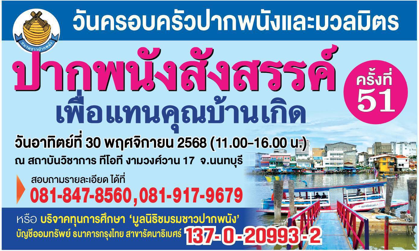 มูลนิธิชมรมชาวปากพนัง จัดงานวันครอบครัวชาวปากพนังและมวลมิตร”ปากพนังสังสรรค์”ครั้งที่ 51 ประจำปี2568 เพื่อระดมทุนการศึกษาให้กับนักเรียน ในวันอาทิตย์ที่ 30 พฤศจิกายน 2568 ที่สถาบันวิชาการทีโอที งามวงศ์วาน 17 นนทบุรี เวลา 11.00-16.00 น.