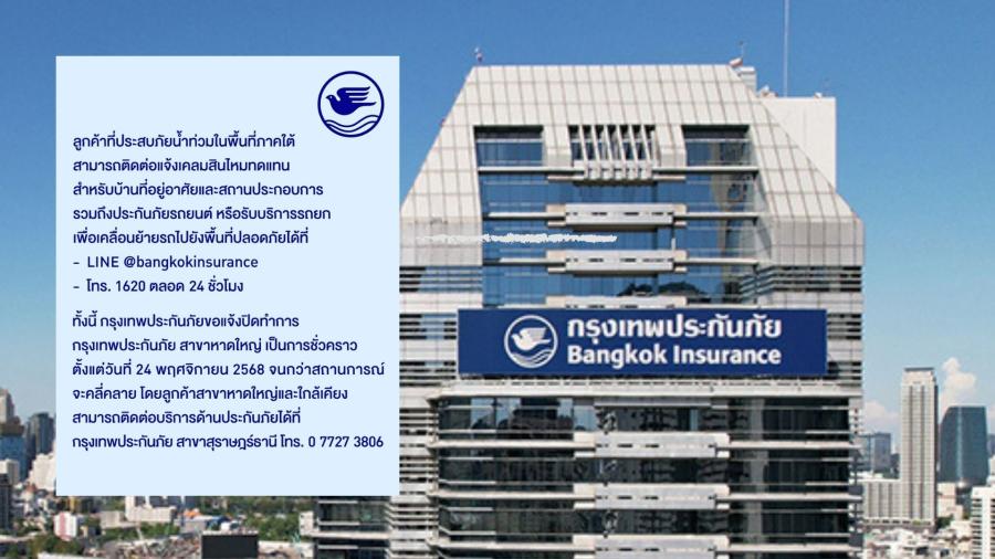 จากสถานการณ์อุทกภัยส่งผลให้เกิดน้ำท่วมฉับพลันในหลายพื้นที่ของภาคใต้ โดยขณะนี้จังหวัดสงขลาประกาศเป็นเขตภัยพิบัติ บริษัท กรุงเทพประกันภัย จำกัด (มหาชน) ได้คำนึงถึงความปลอดภัยของลูกค้าและพนักงาน จึงขอแจ้งปิดทำการกรุงเทพประกันภัย สาขาหาดใหญ่ เป็นการชั่วคราว ตั้งแต่วันที่24 พฤศจิกายน 2568 จนกว่าสถานการณ์จะคลี่คลาย โดยลูกค้าสาขาหาดใหญ่และใกล้เคียงสามารถติดต่อบริการด้านประกันภัยได้ที่ กรุงเทพประกันภัย สาขาสุราษฎร์ธานี โทร. 0 7727 3806