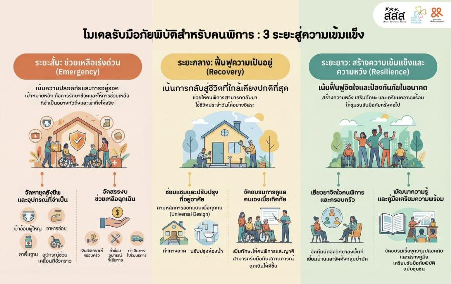 ผู้จัดการกองทุน สสส. กล่าวต่อว่า เพื่ออุดช่องว่างดังกล่าว สสส. จึงร่วมกับมูลนิธินวัตกรรมทางสังคม มูลนิธิด้วยกันเพื่อคนพิการและสังคม และภาคีเครือข่าย ผลักดัน "โครงการช่วยเหลือผู้ประสบภัยที่เป็นคนพิการ (Emergency – Recovery – Resilience Model)" ผ่านแผนงานแบบครบวงจร 3 ระยะ คือ 1.ระยะสั้น ช่วยเหลือเร่งด่วน เน้น “ความปลอดภัย การอยู่รอดเข้าถึงได้จริง” โดยจัดทีมลงพื้นที่เช็คความปลอดภัย จัดการช่วยเหลือด้านสุขภาพขั้นพื้นฐาน อุปกรณ์การแพทย์ที่จำเป็น ให้การดูแลกลุ่มที่ช่วยเหลือตนเองไม่ได้ จัดหาชุดยังชีพ สิ่งของ และอุปกรณ์ที่จำเป็น เช่น ผ้าอ้อมผู้ใหญ่ อาหารบด อาหารอ่อน ยาและอุปกรณ์การแพทย์พื้นฐาน รวมถึงงบประมาณช่วยเหลือฉุกเฉิน งบฟื้นฟูสำหรับอุปกรณ์ช่วยเหลือที่เสียหายจากภัยพิบัติ เบี้ยเดินทางสำหรับการเข้าถึงบริการสาธารณสุข 2.ระยะกลาง ฟื้นฟูความเป็นอยู่ เน้น “กลับไปใช้ชีวิตได้ใกล้เคียงปกติที่สุด” ปรับปรุงที่อยู่อาศัยและสภาพแวดล้อมที่เสียหายด้วย Universal Design ช่วยจัดพื้นที่ให้ปลอดภัย ป้องกันการลื่นล้ม วางระบบไฟ สวิทช์ ห้องน้ำให้เหมาะกับผู้ใช้รถเข็นหรือผู้พิการทางการมองเห็น จัดอบรมคนพิการให้ดูแลตัวเอง โดยแบ่งประเภทตามภัยพิบัติที่อาจเกิดขึ้น เช่น ไฟไหม้ น้ำท่วม แผ่นดินไหว และแบ่งประเภทความพิการในการช่วยเหลือ