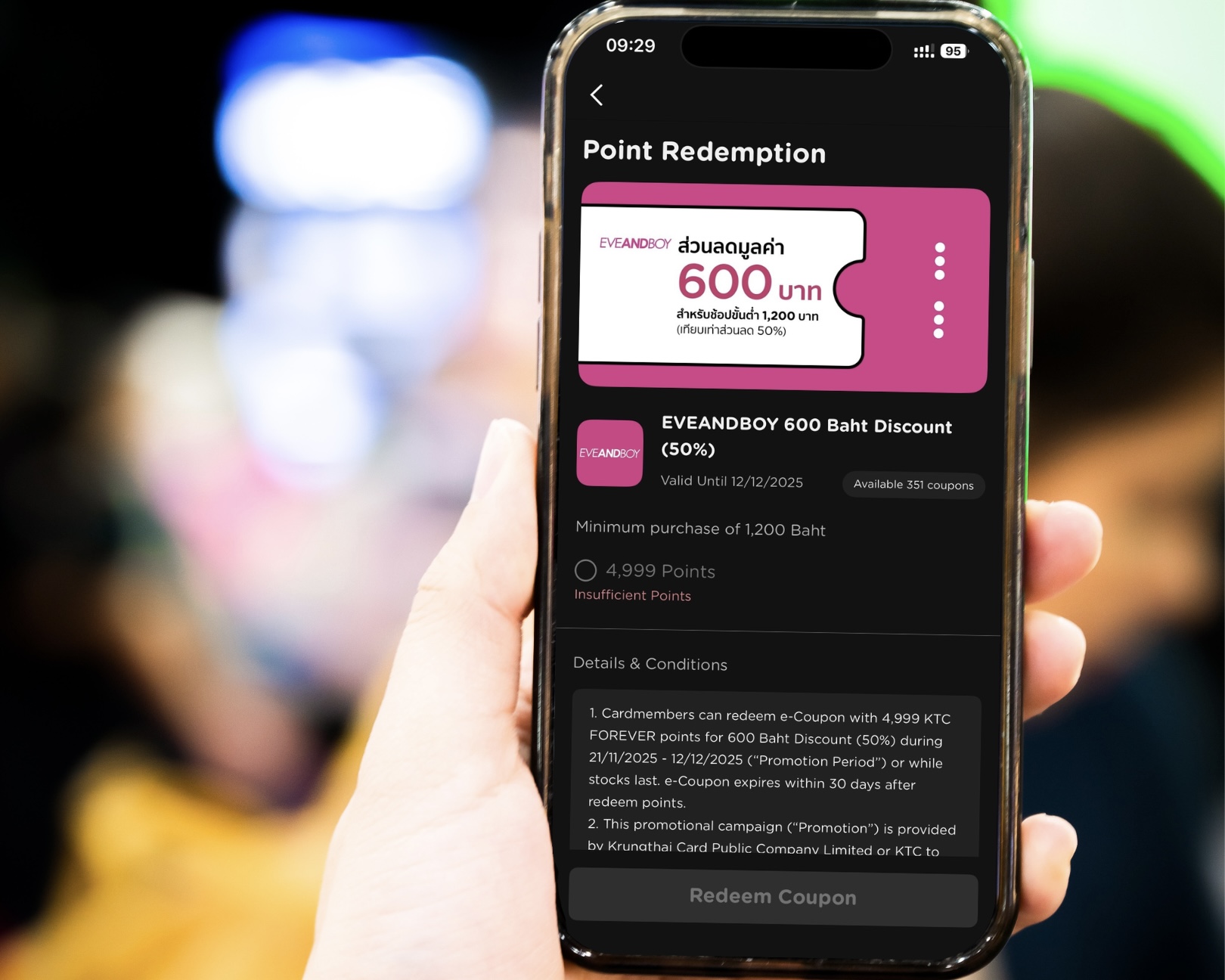สมาชิกบัตรเครดิตเคทีซีทุกประเภท รับสิทธิพิเศษเมื่อช้อปที่ร้าน EVEANDBOY เฉพาะช่วง END YEAR GRAND SALE 2025 เพียงแลกคะแนน KTC FOREVER ผ่านแอป KTC Mobile รับส่วนลดทันทีสูงสุด 70% (สิทธิ์นี้เฉพาะการช้อปที่หน้าร้าน ไม่รวมช่องทางออนไลน์) ระหว่างวันที่ 21 พฤศจิกายน – วันที่ 12 ธันวาคม 2568