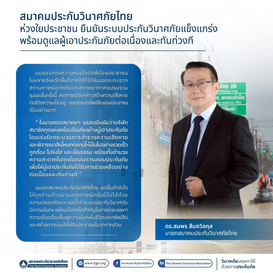 สมาคมประกันวินาศภัยไทยแสดงความห่วงใยต่อประชาชนในหลายจังหวัดพื้นที่ภาคใต้ที่ได้รับผลกระทบจากสถานการณ์อุทกภัยและสภาพอากาศแปรปรวนรุนแรง ซึ่งสร้างความเสียหายต่อชีวิต ความเป็นอยู่ และทรัพย์สินของประชาชนในวงกว้าง