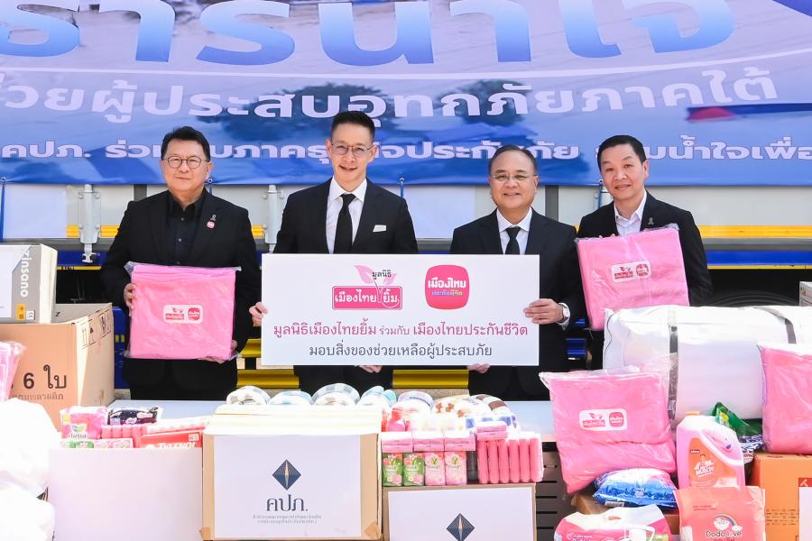 บริษัท เมืองไทยประกันชีวิต จำกัด (มหาชน) และมูลนิธิเมืองไทยยิ้ม ร่วมสนับสนุนการช่วยเหลือ ผู้ประสบอุทกภัยในพื้นที่ภาคใต้ ผ่านโครงการ “ธารน้ำใจช่วยผู้ประสบภัยภาคใต้” ของสำนักงานคณะกรรมการกำกับและส่งเสริมการประกอบธุรกิจประกันภัย (คปภ.) โดยได้ส่งมอบผ้าห่มเพื่อช่วยบรรเทาความเดือดร้อนและสร้างขวัญกำลังใจให้แก่ประชาชนที่ได้รับผลกระทบจากสถานการณ์น้ำท่วม ในหลายจังหวัดภาคใต้
