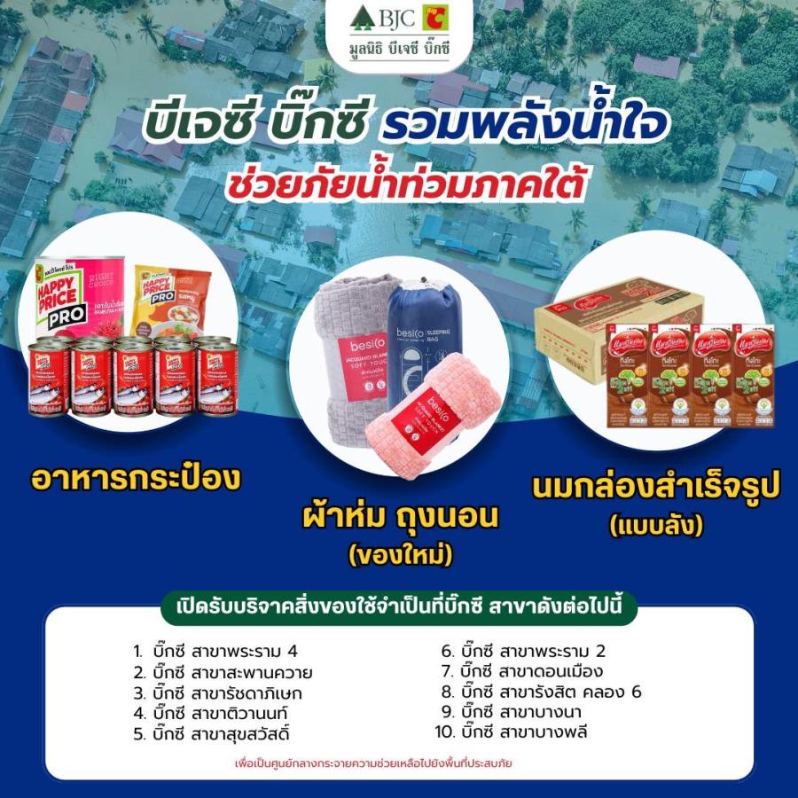 มูลนิธิ บีเจซี บิ๊กซี พร้อมด้วย กลุ่มบีเจซี บิ๊กซี และ บิ๊กซี ซูเปอร์เซ็นเตอร์ ขอเชิญชวนประชาชนร่วมบริจาคสิ่งของเครื่องใช้ที่จำเป็น เพื่อร่วมช่วยเหลือพี่น้องประชาชนในพื้นที่ภาคใต้ที่กำลังประสบอุทกภัย โดยสิ่งของที่ได้รับจะถูกนำไปจัดทำถุงยังชีพ และกระจายส่งต่อแก่ผู้ได้รับผลกระทบอย่างเร่งด่วน