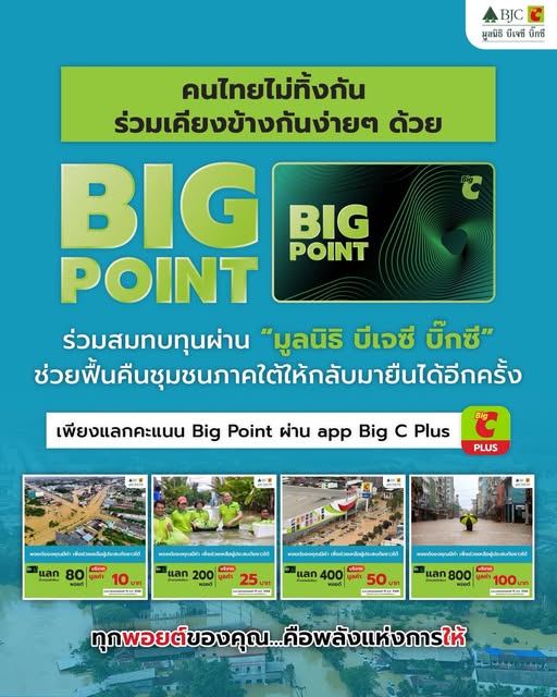 นอกจากนี้ บิ๊กซี ยังจัดทำโครงการ คนไทยไม่ทิ้งกัน ร่วมเคียงข้างกันง่าย ๆ ด้วย BIG POINT เพื่อเชิญชวนร่วมสมทบทุนผ่าน “มูลนิธิ บีเจซี บิ๊กซี ” ช่วยฟื้นคืนชุมชนภาคใต้ให้กลับมายืนได้อีกครั้ง ผ่านการแลกคะแนน Big Point ผ่าน app Big C Plus เพราะ “ทุกพอยต์ของคุณ...คือพลังแห่งการให้”