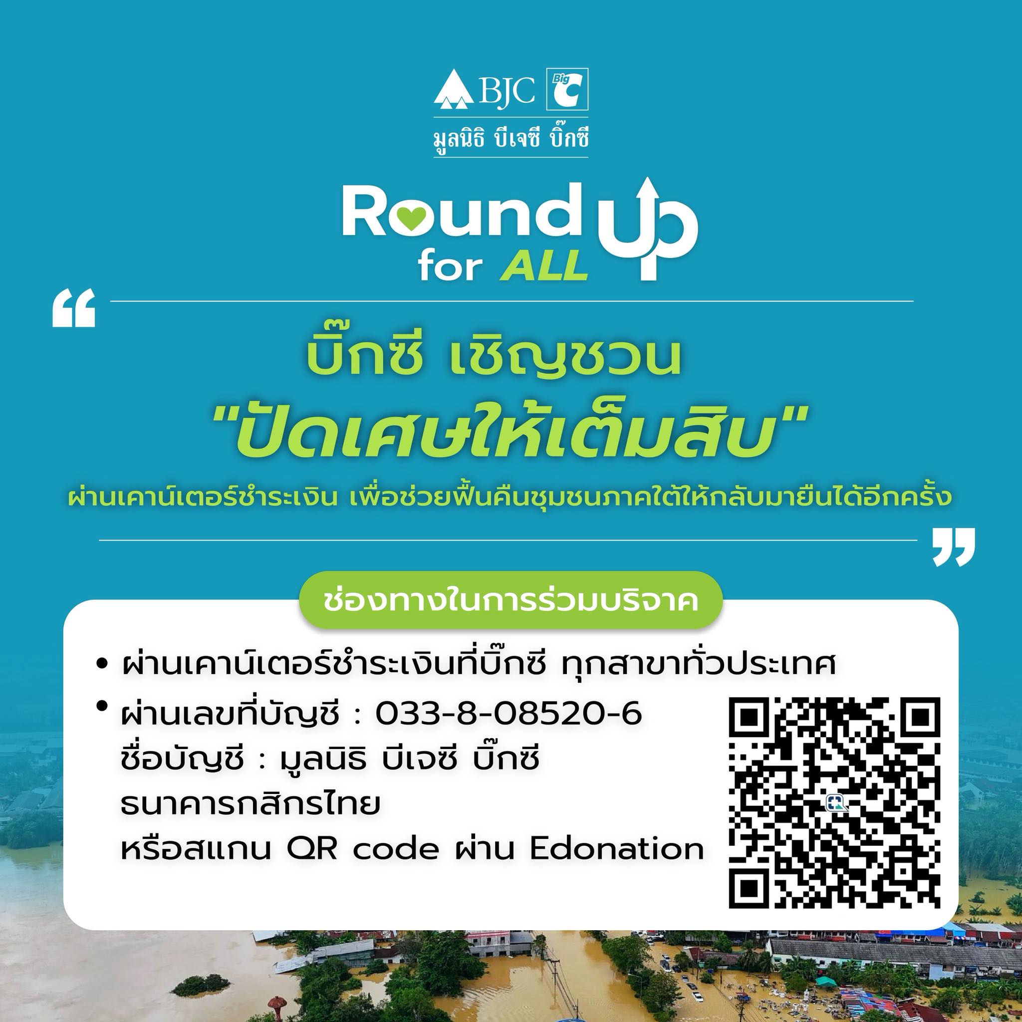 ตลอดจนจัดทำ โครงการ “Round Up for All” ที่ บิ๊กซี เชิญชวน “ปัดเศษให้เต็มสิบ” ผ่านเคาน์เตอร์ชำระเงิน เพื่อช่วยฟื้นคืนชุมชนภาคใต้ให้กลับมายืนได้อีกครั้ง โดยมีช่องทางการร่วมบริจาคหลากหลาย ทั้งการบริจาคผ่านเคาน์เตอร์ชำระเงินที่บิ๊กซี ทุกสาขาทั่วประเทศ หรือผ่านเลขที่บัญชี: 033-8-08520-6 ชื่อบัญชี: มูลนิธิ บีเจซี บิ๊กซี ธนาคารกสิกรไทย