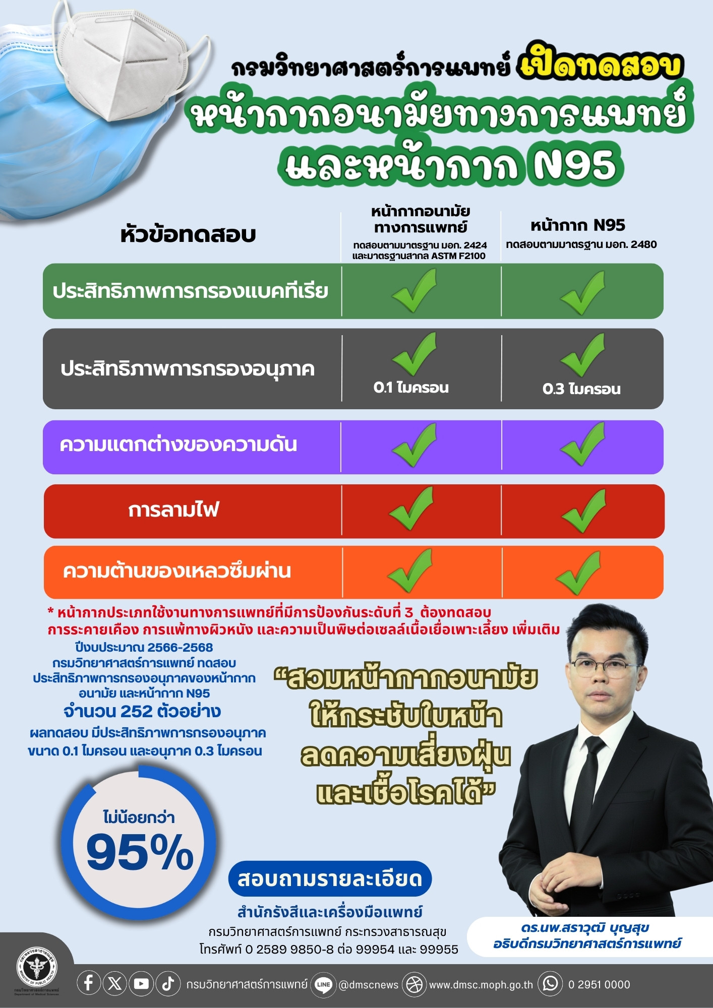 ทั้งนี้ผู้ประกอบการสามารถสอบถามการส่งตัวอย่างหน้ากากอนามัยทางการแพทย์ และหน้ากาก N95 เพื่อทดสอบประสิทธิภาพได้ที่ศูนย์รวมบริการกรมวิทยาศาสตร์การแพทย์ โทรศัพท์ 0 2589 9850-8 ต่อ 98151 และ 99968 หรือสำนักรังสีและเครื่องมือแพทย์ กรมวิทยาศาสตร์การแพทย์ กระทรวงสาธารณสุข โทรศัพท์ 0 2589 9850-8 ต่อ 99954 และ 99955