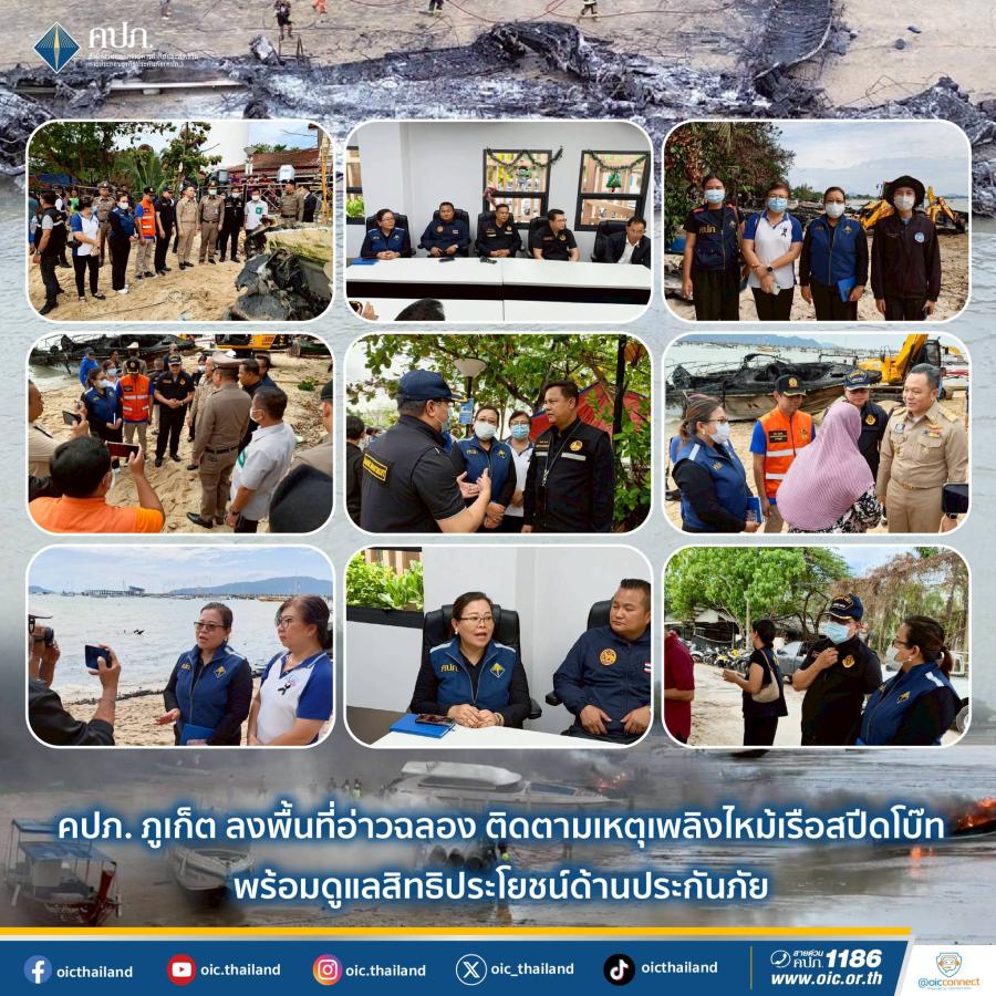 จากการลงพื้นที่ร่วมกับนายนิรัตน์ พงษ์สิทธิถาวร ผู้ว่าราชการจังหวัดภูเก็ต และหน่วยงานที่เกี่ยวข้อง เพื่อติดตามสถานการณ์ รับทราบความเสียหาย และแนวทางการให้ความช่วยเหลือผู้ประกอบการและประชาชนที่ได้รับผลกระทบจากเหตุการณ์ดังกล่าว พบว่า เรือสปีดโบ๊ทของผู้ประกอบการธุรกิจท่องเที่ยวหลายลำได้รับความเสียหายจากเหตุเพลิงไหม้ มีมูลค่าความเสียหายเบื้องต้นประมาณ 38000000 บาท โดยขณะนี้อยู่ระหว่างการรวบรวมข้อเท็จจริงเกี่ยวกับจำนวนเรือที่ได้รับความเสียหาย มูลค่าความเสียหาย รวมถึงข้อมูลด้านการเอาประกันภัย เพื่อเตรียมดำเนินการให้ความช่วยเหลือเป็นไปอย่างถูกต้อง ครบถ้วน รวดเร็ว และเป็นธรรม ในการดำเนินการช่วยเหลือในเบื้องต้น สำนักงาน คปภ. จังหวัดภูเก็ต ได้ประสานบริษัทประกันภัยที่เกี่ยวข้องเพื่อตรวจสอบข้อมูลการรับประกันภัยและความคุ้มครองตามกรมธรรม์ ประสานสำนักงานเจ้าท่าภูมิภาคสาขาภูเก็ต เพื่อขอทราบข้อมูลทะเบียนเรือ รวมทั้งประสานพนักงานสอบสวนสถานีตำรวจภูธรฉลอง เพื่อขอทราบผลการตรวจสอบและข้อมูลการสอบสวนสาเหตุของเหตุเพลิงไหม้ พร้อมทั้งติดตามและรวบรวมรายงานความเสียหายผ่านระบบอิเล็กทรอนิกส์ และให้คำแนะนำแก่ผู้ประกอบการและผู้ได้รับผลกระทบเกี่ยวกับขั้นตอนการเรียกร้องค่าสินไหมทดแทนตามสิทธิประโยชน์ด้านการประกันภัย