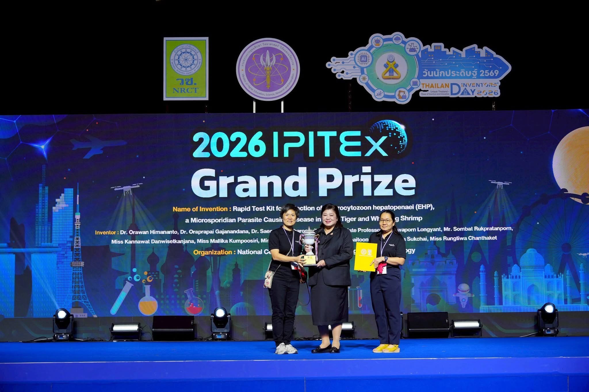 - ผลงานเรื่อง “Rapid Test Kit for Detection of Enterocytozoon hepatopenaei (EHP) a Microsporidian Parasite Causing Disease in Black Tiger and White leg Shrimp” จากศูนย์พันธุวิศวกรรมและเทคโนโลยีชีวภาพแห่งชาติ