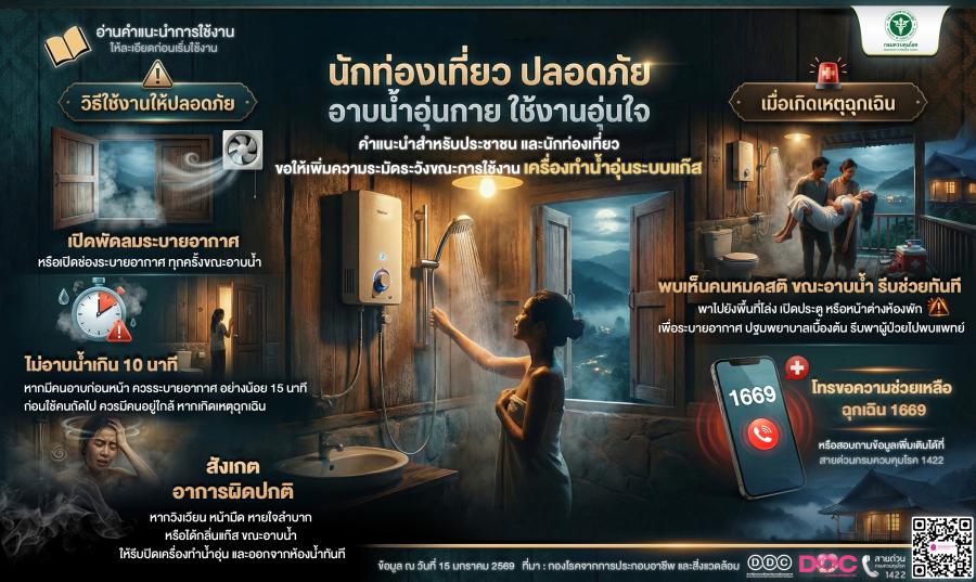 ด้าน นายแพทย์เอนก มุ่งอ้อมกลาง รองอธิบดีกรมควบคุมโรค กล่าวเพิ่มเติมว่า อีกหนึ่งประเด็นที่ต้องเพิ่มความระมัดระวังในช่วงอากาศหนาว คือ การใช้เครื่องทำน้ำอุ่นในที่พัก โรงแรม หรือโฮมสเตย์ ซึ่งมีการใช้งานเพิ่มขึ้นอย่างมาก โดยในแต่ละปีพบรายงานอุบัติเหตุจากการใช้เครื่องทำน้ำอุ่นที่ไม่ได้มาตรฐานหรือใช้งานไม่ถูกวิธีอยู่เรื่อยๆ โดยเฉพาะเครื่องทำน้ำอุ่นแก๊สที่ติดตั้งในพื้นที่ปิด ก่อให้เกิดอันตรายร้ายแรงถึงชีวิต แนะนำให้เลือกที่พักที่มีการติดตั้งเครื่องทำน้ำอุ่นได้มาตรฐาน มีระบบสายดินและเครื่องตัดไฟรั่ว ตรวจสอบสภาพสายไฟและตัวเครื่องก่อนใช้งาน ไม่ใช้ขณะร่างกายเปียกหรือมีอุปกรณ์ไฟฟ้าอื่นอยู่ใกล้ และควรปิดสวิตช์ทุกครั้งหลังใช้งาน