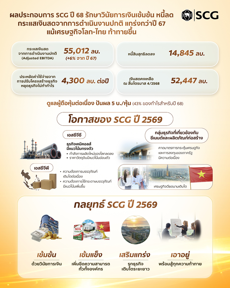 กรุงเทพฯ – 29 มกราคม 2569 : ผลประกอบการเอสซีจีปี 68 รักษาวินัยการเงินเข้มข้น กระแสเงินสดจากการดำเนินงานปกติ ที่ไม่รวมรายการพิเศษ (Adjusted EBITDA) 55012 ล้านบาท แข็งแกร่งกว่าปี 67 คิดเป็น 6% ขณะที่หนี้ลดลง 14845 ล้านบาทจากปีก่อน แม้เศรษฐกิจโลกและไทยท้าทายขึ้น ชี้ผลการปรับโครงสร้างธุรกิจ หยุดธุรกิจไม่ทำกำไร และประหยัดค่าใช้จ่าย ได้รวมกว่า 4300 ล้านบาทต่อปี พร้อมเคาะปันผล 5.0 บาท/หุ้น ดูแลผู้ถือหุ้นต่อเนื่อง ปี 2569 ธุรกิจเคมิคอลส์มีแนวโน้มทรงตัว เนื่องจากกำลังการผลิตใหม่ของโลกลดลง และราคาวัตถุดิบมีแนวโน้มอ่อนตัว เอสซีจีจึงเดินหน้าเข้มข้น ด้วยวินัยการเงิน – เข้มแข็ง เพิ่มขีดความสามารถทั่วองค์กร – เสริมแกร่ง รุกธุรกิจเติบโตระยะยาว มุ่งกลยุทธ์ Regional Optimization ชูเวียดนาม เป็นฐานผลิตรับตลาดในประเทศและส่งออกตลาดโลก พร้อมดันสินค้า SVP - HVA และ Green ที่แนวโน้มเติบโตสูง – เอาอยู่ พร้อมสู้ทุกความท้าทาย