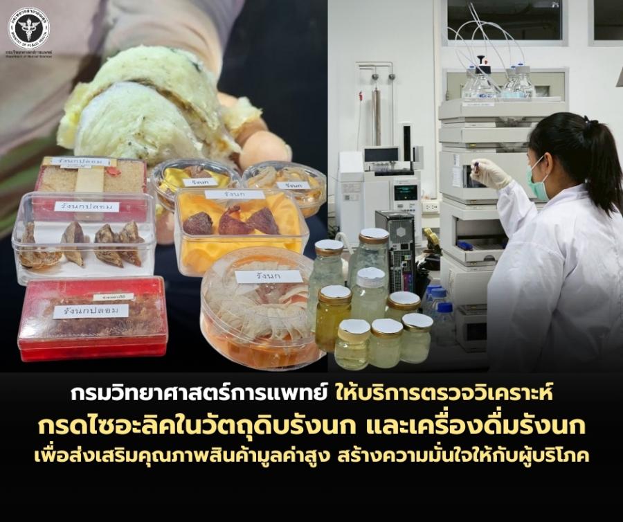 กรมวิทยาศาสตร์การแพทย์ ให้บริการตรวจวิเคราะห์กรดไซอะลิคในวัตถุดิบรังนก และเครื่องดื่มรังนก เพื่อส่งเสริมคุณภาพสินค้ามูลค่าสูง สร้างความมั่นใจให้กับผู้บริโภค