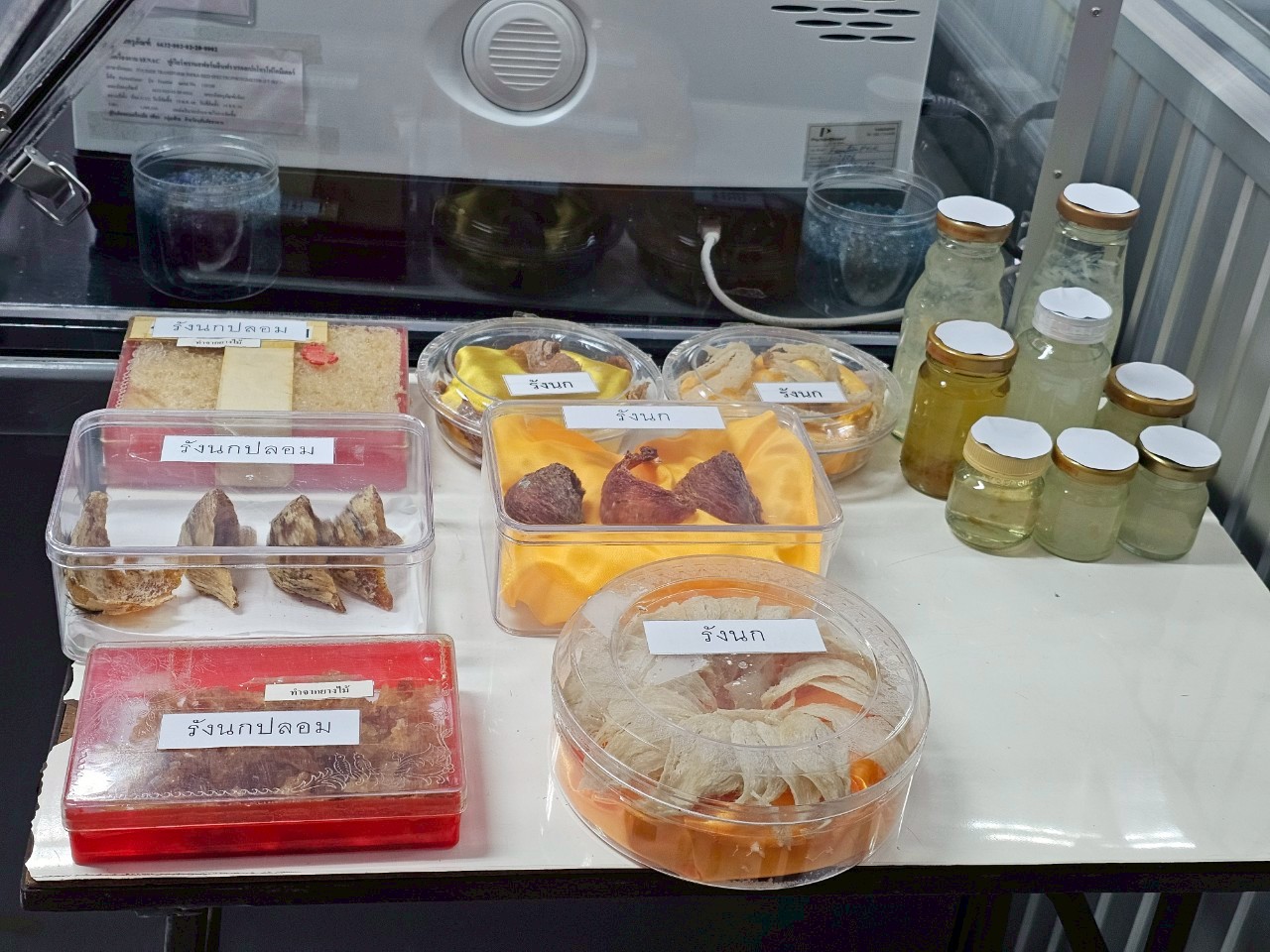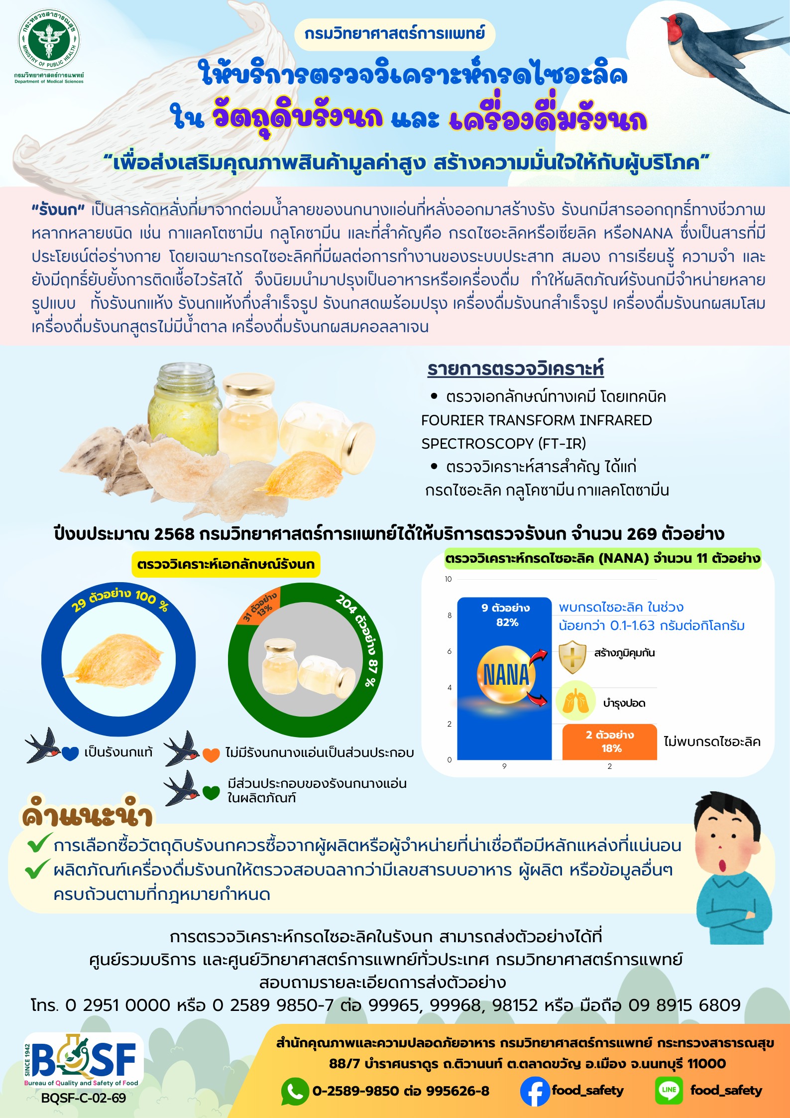 ทั้งนี้ที่ผ่านมาในปีงบประมาณ 2568 กรมวิทยาศาสตร์การแพทย์ได้ให้บริการตรวจเอกลักษณ์รังนก จำนวน 269 ตัวอย่าง แบ่งเป็นวัตถุดิบรังนก จำนวน 29 ตัวอย่าง พบว่าทุกตัวอย่างเป็นรังนกแท้ เมื่อเปรียบเทียบ Infrared spectrum กับรังนกนางแอ่น และเครื่องดื่มรังนกสำเร็จรูป จำนวน 235 ตัวอย่าง พบว่ามีส่วนประกอบของรังนกนางแอ่นในผลิตภัณฑ์ จำนวน 204 ตัวอย่าง (ร้อยละ 87) ไม่มีรังนกนางแอ่นเป็นส่วนประกอบ จำนวน 31 ตัวอย่าง (ร้อยละ 13) ตรวจวิเคราะห์กรดไซอะลิค จำนวน 11 ตัวอย่าง ไม่พบกรดไซอะลิค จำนวน 2 ตัวอย่าง (ร้อยละ 18) พบกรดไซอะลิค ในช่วง น้อยกว่า 0.1-1.63 กรัมต่อกิโลกรัม จำนวน 9 ตัวอย่าง (ร้อยละ 82)