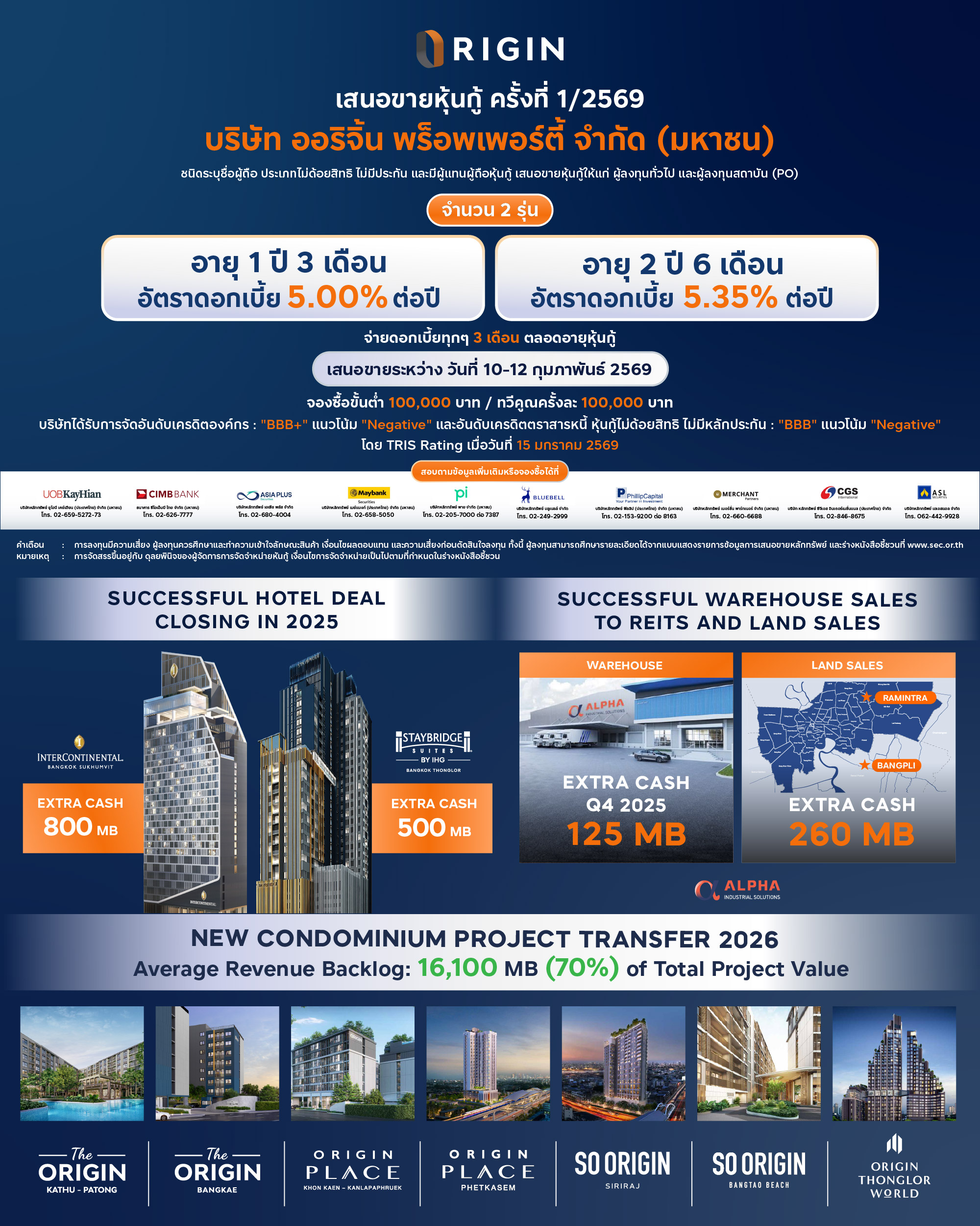 ออริจิ้น เดินหน้าสร้างรายได้ต่อเนื่อง ล่าสุดขายคลังสินค้าเข้ากอง REIT แบรนด์ แอลฟา (ALPHA) คว้า Extra Cash 125 ล้านบาทตามแผน พร้อมจำหน่ายทรัพย์สินที่ดินพร้อมพัฒนา 2 แปลง รับ Extra Cash 260 ล้านบาท อีกทั้งในปี 2569 นี้ มี Backlog คอนโดฯ 7 โครงการที่พร้อมโอนให้ลูกค้า มูลค่ากว่า 16000 ล้านบาท ช่วยลดความเสี่ยงจากความผันผวนของธุรกิจ พร้อมเสนอขายหุ้นกู้ครั้งที่ 1/2569 ระหว่าง 10-12 กุมภาพันธ์ นี้ จำนวน 2 ชุด ชุดที่ 1 หุ้นกู้อายุ 1 ปี 3 เดือน อัตราดอกเบี้ย 5.00% และ ชุดที่ 2 หุ้นกู้อายุ 2 ปี 6 เดือน อัตราดอกเบี้ย 5.35% จ่ายดอกเบี้ยทุก 3 เดือน
