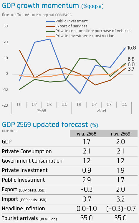 • Krungthai COMPASS คาดว่าเศรษฐกิจไทยในปี 2569 จะขยายตัวได้ที่ 1.8%YoY จากความเสี่ยงด้านภูมิรัฐศาสตร์และมาตรการภาษีสหรัฐฯ ที่อาจกระทบต่ออุปสงค์โลก ประกอบกับภาคครัวเรือนและ SME ยังอยู่ในภาวะเปราะบาง อย่างไรก็ดี การจัดตั้งรัฐบาลที่มีเสถียรภาพและการเร่งกระบวนการจัดทำงบประมาณปี 2570 จะเป็นปัจจัยสนับสนุนเศรษฐกิจในระยะข้างหน้า