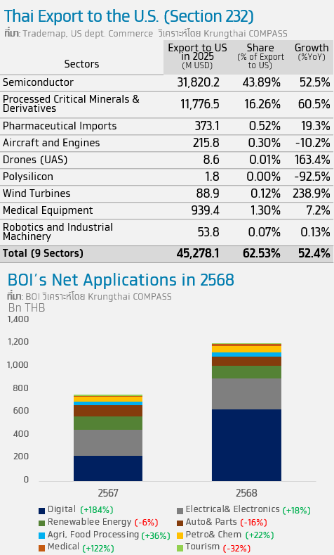 • Krungthai COMPASS ประเมินว่าแม้เศรษฐกิจไตรมาสที่ 4 ปี 2568 จะขยายตัวสูงกว่าที่คาดที่ 2.5%YoY แต่แนวโน้มระยะข้างหน้ายังมีความท้าทาย จากการส่งออกสินค้าของไทยในปี 2569 ที่แม้สภาพัฒน์ฯ คาดว่าจะไม่หดตัว แต่ยังมีความไม่แน่นอนสูง โดยเฉพาะการส่งออกไปยังสหรัฐฯ ที่มาตรการทางภาษีมีความผันผวนจากผลของคำตัดสินของศาลสูงสหรัฐฯ ต่ออำนาจประธานาธิบดีในการบังคับใช้ Reciprocal tariff อย่างไรก็ดี การส่งออกไทยในปีนี้เผชิญความเสี่ยงเพิ่มเติมจากภาษี Sectoral tariff (Section 232) ที่มีอีกอย่างน้อย 9 กลุ่มสินค้าที่จะได้รับผลกระทบ ซึ่งรวมสินค้ากลุ่ม Semiconductor ที่ขยายตัวสูงถึง 52.5% ในปี 2568 และคิดเป็นกว่า 44% ของมูลค่าการส่งออกไทยไปยังสหรัฐฯ