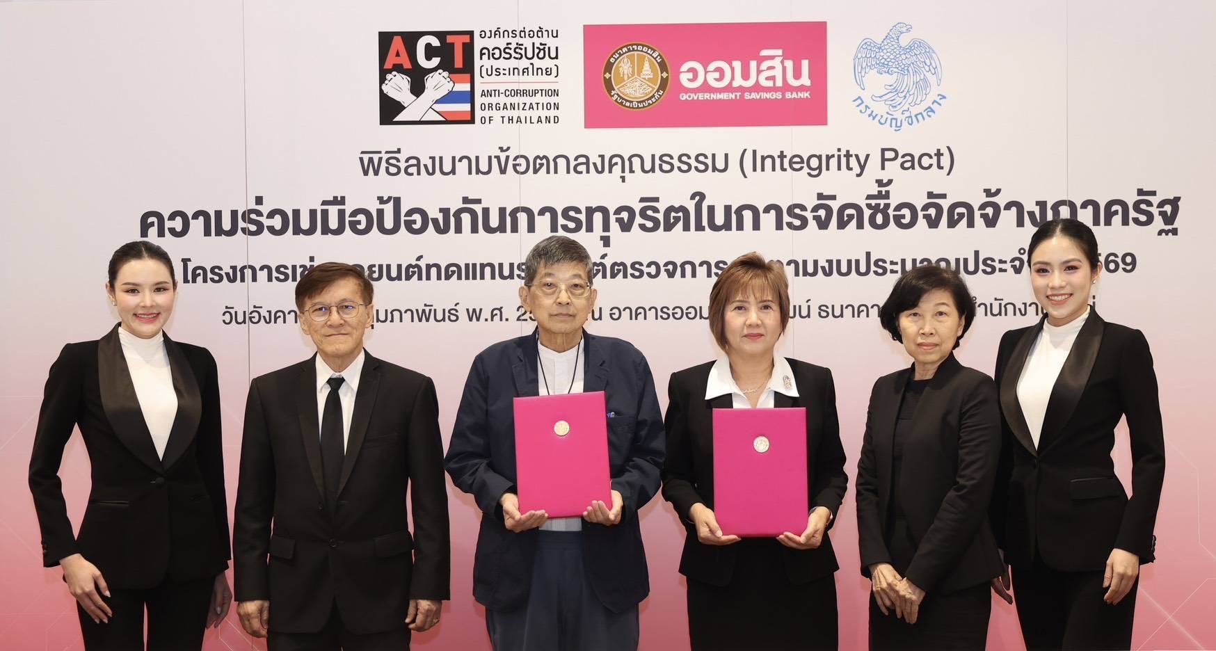 นางญดาภรณ์ ศรีพัฒน์ รองผู้อำนวยการธนาคารออมสิน กลุ่มปฏิบัติการ ลงนามบันทึกข้อตกลงคุณธรรม (Integrity Pact) กับคณะผู้สังเกตการณ์ตามข้อตกลงคุณธรรม องค์กรต่อต้านคอร์รัปชัน (ประเทศไทย) โดยมี กรมบัญชีกลาง เป็นสักขีพยาน ในความร่วมมือป้องกันการทุจริตในการจัดซื้อจัดจ้างภาครัฐ โครงการเช่ารถยนต์ทดแทนรถยนต์ตรวจการณ์ เพื่อใช้ในธุรกิจของธนาคารประจำสายงานกิจการสาขา และฝ่ายงานที่เกี่ยวข้อง ทดแทนสัญญาเช่าเดิมที่จะครบอายุสัญญา ซึ่งเป็นความร่วมมือป้องกันการทุจริตในการจัดซื้อจัดจ้างภาครัฐ ตามยุทธศาสตร์ในการป้องกันและปราบปรามการทุจริตคอร์รัปชันอย่างยั่งยืนของรัฐบาล ที่มีนโยบายส่งเสริมการบริหารงานที่มีธรรมาภิบาล และการป้องกันปราบปรามการทุจริตและประพฤติมิชอบในภาครัฐที่สร้างความไม่เป็นธรรมและเหลื่อมล้ำในสังคม