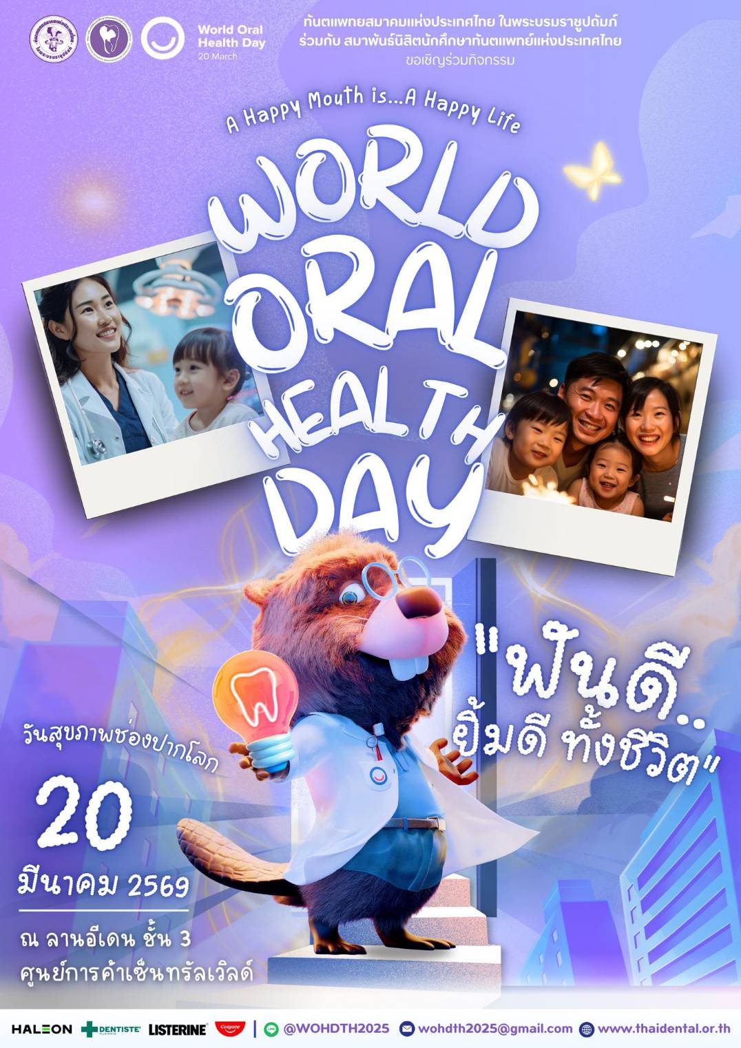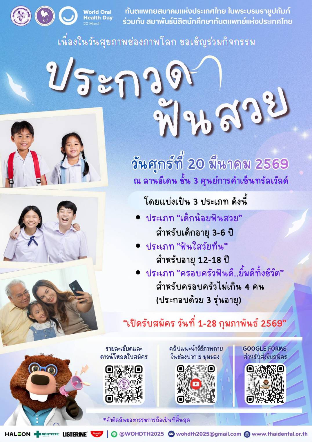 ทันตแพทยสมาคมแห่งประเทศไทย ในพระบรมราชูปถัมภ์ ร่วมกับ สมาพันธ์นิสิตนักศึกษาทันตแพทย์แห่งประเทศไทย (สนทท.) และภาคีเครือข่ายด้านทันตสุขภาพทั้งภาครัฐและเอกชน เตรียมจัดกิจกรรมเนื่องในวันสุขภาพช่องปากโลก (World Oral Health Day) ประจำปี 2569 ในวันที่ 20 มีนาคม 2569 ณ ลาน Eden ชั้น 3 ศูนย์การค้าเซ็นทรัลเวิลด์ เพื่อรณรงค์สร้างความตระหนักรู้ให้ประชาชนทุกช่วงวัยเห็นความสำคัญของการดูแลสุขภาพช่องปากอย่างต่อเนื่อง พร้อมเปิดเวทีประกวดสุขภาพฟันดี ชิงเงินรางวัลรวมกว่า 20000 บาท