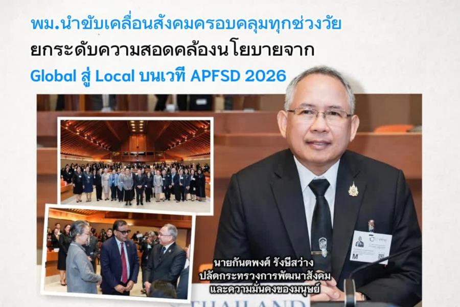 นายกันตพงศ์ รังษีสว่าง ปลัดกระทรวงการพัฒนาสังคมและความมั่นคงของมนุษย์ ได้กล่าวเปิดการประชุมในกิจกรรมคู่ขนานภายใต้การประชุม “Asia-Pacific Forum on Sustainable Development หรือ APFSDประจำปี 2569” ณ ศูนย์ประชุมสหประชาชาติ กรุงเทพมหานคร โดยเน้นย้ำถึงความจำเป็นเร่งด่วนในการเชื่อมโยงกรอบความร่วมมือระดับโลกกับการจัดลำดับความสำคัญระดับภูมิภาคและบริบทระดับพื้นที่ โดยเฉพาะอย่างยิ่งเพื่อรองรับการเปลี่ยนแปลงโครงสร้างประชากรอย่างมีนัยสำคัญ รวมถึงการเข้าสู่สังคมสูงวัยอย่างรวดเร็ว
