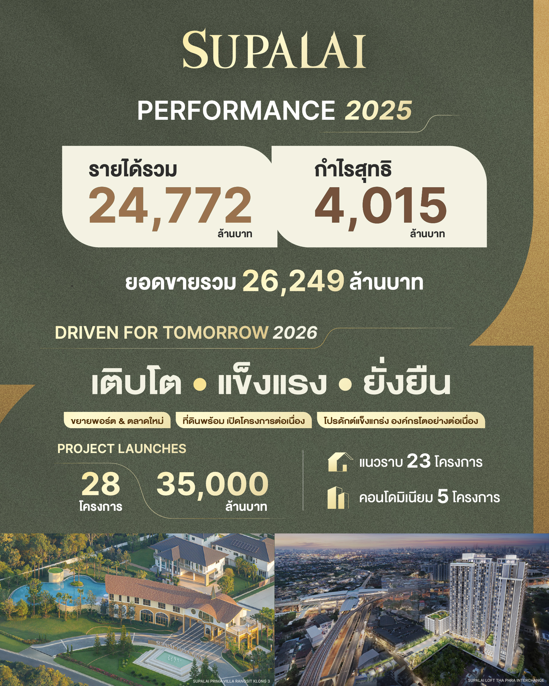 นายไตรเตชะ ตั้งมติธรรม กรรมการผู้จัดการ บริษัท ศุภาลัย จำกัด (มหาชน) กล่าวว่า ภาพรวมการดำเนินงานปี 2568 เป็นอีกบทพิสูจน์ถึงความแข็งแกร่งของบริษัทฯ แม้ตลาดอสังหาริมทรัพย์ยังเผชิญความผันผวนจากกำลังซื้อและภาวะเศรษฐกิจ แต่บริษัทฯ ยังสามารถรักษาเสถียรภาพรายได้และกำไรได้อย่างต่อเนื่อง จากการบริหารพอร์ตโครงการอย่างสมดุลทั้งในกรุงเทพฯ ปริมณฑล และภูมิภาค ควบคู่การขยายการลงทุนในต่างประเทศ ส่งผลให้บริษัทฯ มีรายได้รวม 24772 ล้านบาท และกำไรสุทธิ 4015 ล้านบาท โดยในปีที่ผ่านมา บริษัทฯ เปิดตัวโครงการใหม่รวม 22 โครงการ มูลค่ารวม 29470 ล้านบาท โดยยอดขายยังคงได้รับแรงขับเคลื่อนหลักจากโครงการแนวราบที่ตอบโจทย์ ดีมานด์อยู่อาศัยจริง สร้างยอดขาย 17087 ล้านบาท ขณะที่คอนโดมิเนียมในทำเลใจกลางเมือง ใกล้ระบบรถไฟฟ้า และโครงการสร้างเสร็จพร้อมอยู่และระหว่างก่อสร้าง ยังได้รับการตอบรับอย่างต่อเนื่อง มียอดขาย 9162 ล้านบาท สำหรับการกระจายพอร์ตสู่ตลาดภูมิภาคยังเป็นแรงขับเคลื่อนสำคัญ โดยเฉพาะทำเลยอดนิยมที่สามารถสร้างยอดขายได้ในระดับสูง ได้แก่ ภูเก็ต ชลบุรี และเชียงใหม่ ขณะเดียวกัน การลงทุนในประเทศออสเตรเลียยังเติบโตอย่างโดดเด่น และถือเป็น New Growth Engine ที่สำคัญของบริษัทฯ ปี 2568 มียอดขายประมาณ 14400 ล้านบาท เติบโตถึง 370% จากปีก่อน สะท้อนถึงความพร้อมในการบริหารขยายการลงทุนอย่างรอบคอบ โดยคำนึงถึงสภาวะตลาดและศักยภาพของแต่ละพื้นที่เป็นสำคัญ อีกทั้งโครงการคอนโดมิเนียมสร้างเสร็จพร้อมส่งมอบอย่างศุภาลัย บลูเวล หัวหิน มูลค่ากว่า 1200 ล้านบาท ยังทยอยรับรู้รายได้อย่างต่อเนื่อง