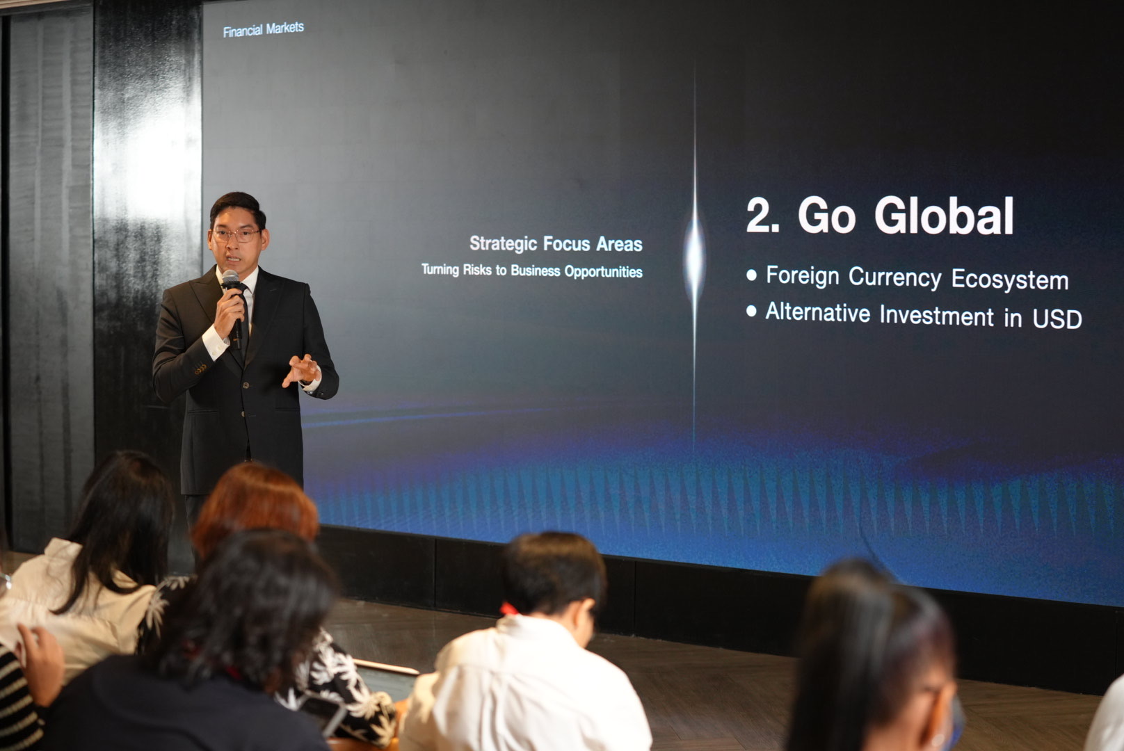 - Go Global สนับสนุนลูกค้าในการกระจายการลงทุนไปยังต่างประเทศ เพื่อเพิ่มโอกาสในการสร้างผลตอบแทนและกระจายแหล่งที่มาของรายได้ โดยธนาคารได้พัฒนาโครงสร้างพื้นฐานรองรับการลงทุนในต่างประเทศ อาทิ บัญชีเงินฝากเงินตราต่างประเทศแบบอิเล็กทรอนิกส์ (E-FCD) เพื่อรองรับการลงทุนที่เป็นสกุลเงินตราต่างประเทศ รวมถึงผลิตภัณฑ์การลงทุนในรูปหุ้นกู้ที่มีอนุพันธ์แฝง (Structured Notes) ที่ถูกออกแบบโดยอ้างอิงสินทรัพย์ต่าง ๆ อาทิ หุ้นสหรัฐฯ ทองคำ และอัตราดอกเบี้ย และมีทางเลือกทั้งการลงทุนเป็นเงินบาทหรือเงินดอลลาร์สหรัฐฯ ช่วยให้นักลงทุนสามารถสร้างผลตอบแทนจากตลาดโลกภายใต้ระดับความเสี่ยงที่เหมาะสมได้ดียิ่งขึ้น ซึ่งในปีที่ผ่านมา ไทยพาณิชย์ก็ได้ออกหุ้นกู้สกุลเงินดอลลาร์สหรัฐฯ ที่มีอนุพันธ์แฝงอ้างอิงกับอัตราดอกเบี้ยระยะสั้นของสหรัฐฯ เป็นธนาคารแรกในประเทศไทย
