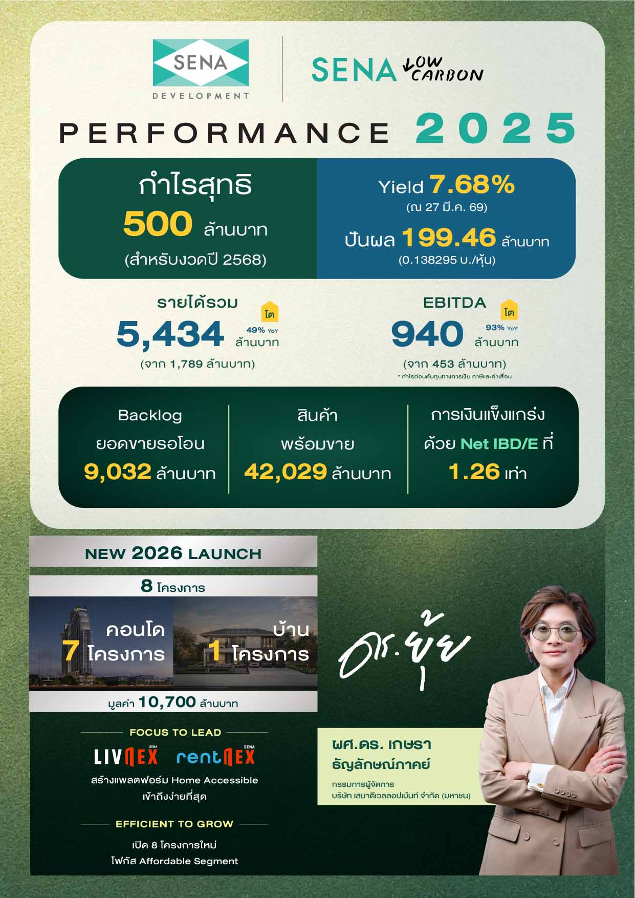 บริษัท เสนาดีเวลลอปเม้นท์ จำกัด (มหาชน) หรือ SENA เผยผลการดำเนินงานปี 2568 เติบโตอย่างโดดเด่น แม้ภาวะตลาดยังถูกกดดันจากเศรษฐกิจและกำลังซื้อภาคครัวเรือนที่ชะลอตัว โดยบริษัทมียอดรับรู้รายได้รวมทุกประเภทธุรกิจ 5434 ล้านบาท เพิ่มขึ้น 1789 ล้านบาท เติบโต 49% จากปีก่อนหน้า ขณะที่กำไรขั้นต้นอยู่ที่ 1661 ล้านบาท เพิ่มขึ้น 537 ล้านบาท เติบโต 48% และมีกำไรก่อนต้นทุนทางการเงิน ส่วนแบ่งกำไรและภาษีเงินได้ 940 ล้านบาท เพิ่มขึ้น 453 ล้านบาท เติบโต 93% สะท้อนประสิทธิภาพในการดำเนินงานและการบริหารต้นทุนที่แข็งแกร่ง พร้อม จ่ายเงินปันผลจากผลการดำเนินงานปี 2568 199.46 ล้านบาท อัตรา 0.138295 บาทต่อหุ้น Dividend Yield ประมาณ 7.68%