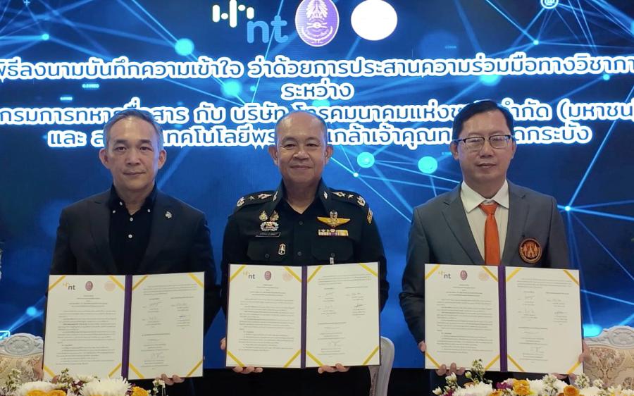 วันที่ 5 มีนาคม 2569 – บริษัท โทรคมนาคมแห่งชาติ จำกัด (มหาชน) หรือ NT ร่วมกับ กรมการทหารสื่อสาร และสถาบันเทคโนโลยีพระจอมเกล้าเจ้าคุณทหารลาดกระบัง (KMITL) ลงนามบันทึกข้อตกลงความร่วมมือทางวิชาการ เพื่อเพิ่มขีดความสามารถด้านการวิจัยและพัฒนาระบบวิเคราะห์ข้อมูลและสั่งการจากอากาศยานไร้คนขับ (UAV) และ CCTV เสริมศักยภาพระบบเฝ้าระวังชายแดน โดยมี พลโท พรเทพ ยังรักษา เจ้ากรมการทหารสื่อสาร ในฐานะหน่วยงานระบบสื่อสารเพื่อความมั่นคงของประเทศ พันเอก สรรพชัยย์ หุวะนันทน์ กรรมการผู้จัดการใหญ่ บริษัท โทรคมนาคมแห่งชาติ จำกัด (มหาชน) หรือ NT ผู้นำด้านโครงสร้างพื้นฐานดิจิทัลของประเทศ และ รองศาสตราจารย์ ดร.สมยศ เกียรติวนิชวิไล คณบดีคณะวิศวกรรมศาสตร์ สถาบันเทคโนโลยีพระจอมเกล้าเจ้าคุณทหารลาดกระบัง