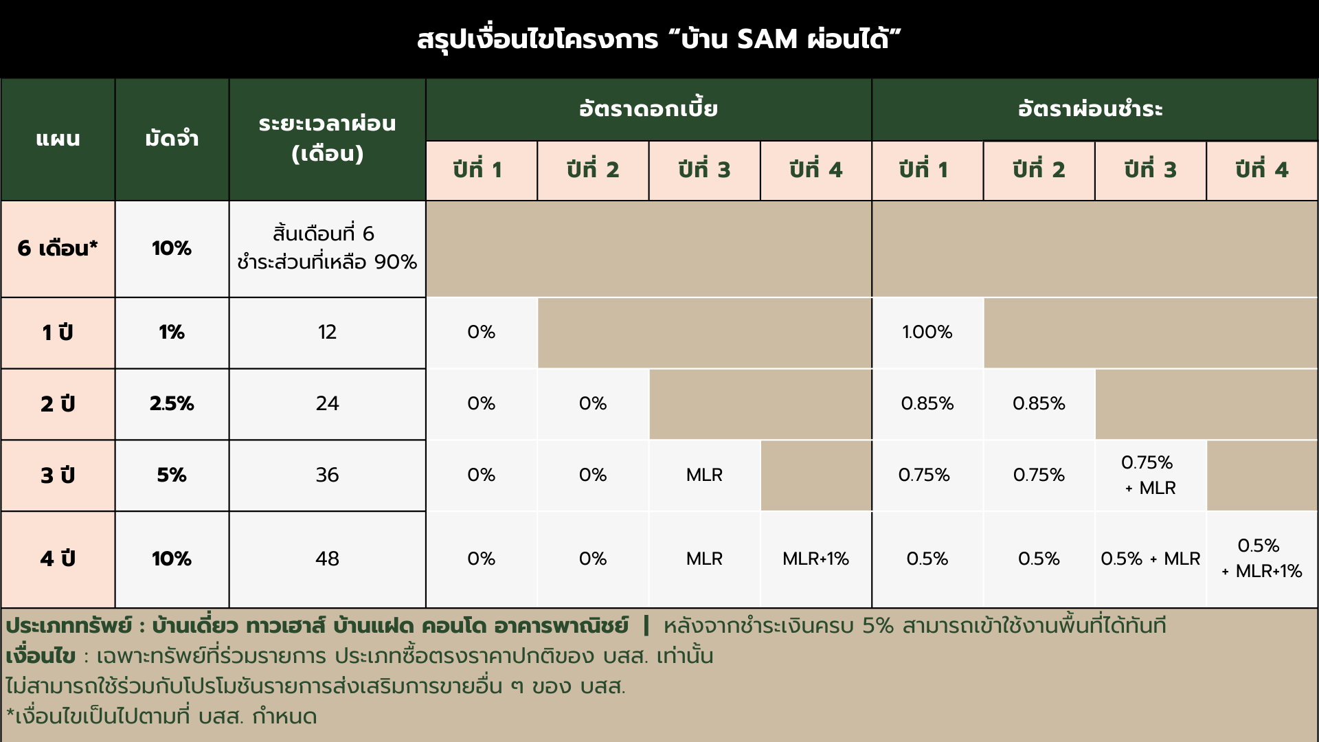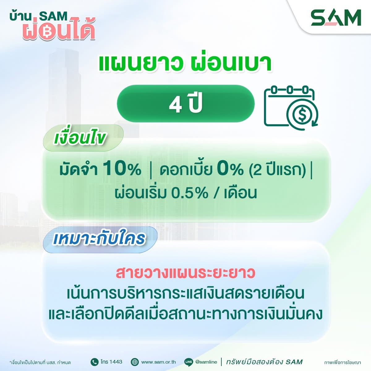 บริษัท บริหารสินทรัพย์สุขุมวิท จำกัด (บสส.) หรือ SAM เดินนหน้าภารกิจสำคัญ “ส่งมอบโอกาสเพื่อคนไทย เริ่มต้นใหม่อย่างยั่งยืน” เปิดตัวแคมเปญพิเศษ “บ้าน SAM ผ่อนได้” โดยคัดทรัพย์สินรอการขาย (NPA) ประเภทที่อยู่อาศัย ไม่ว่าจะเป็น บ้านเดี่ยว ทาวน์เฮาส์ บ้านแฝด คอนโดมิเนียม และอาคารพาณิชย์ กว่า 3300 รายการ บนทำเลศักยภาพทั่วประเทศ ออกจำหน่ายพร้อมเงื่อนไขทางการเงินที่ช่วยประชาชนสามารถเข้าถึงที่อยู่อาศัยได้ง่ายขึ้น โดยแคมเปญพิเศษ “บ้าน SAM ผ่อนได้” ดังกล่าว ลูกค้าสามารถผ่อนชำระโดยตรงกับ SAM ได้นานสูงสุดถึง 4 ปี พร้อมรับ อัตราดอกเบี้ยพิเศษ 0% ใน 2 ปี หรือ 24 เดือนแรก โดย SAM ได้ออกแบบเงื่อนไขการผ่อนชำระให้มีความยืดหยุ่นถึง 5 ทางเลือก เพื่อให้สอดคล้องกับรายได้และความสามารถทางการเงินที่แท้จริงของลูกค้าแต่ละราย และ พิเศษยิ่งขึ้น!! สำหรับลูกค้าที่ชำระเงินครบ 5% ของราคาประกาศขาย สามารถเข้าใช้ประโยชน์ในทรัพย์สินได้ทันที ภายใต้เงื่อนไขที่กำหนด