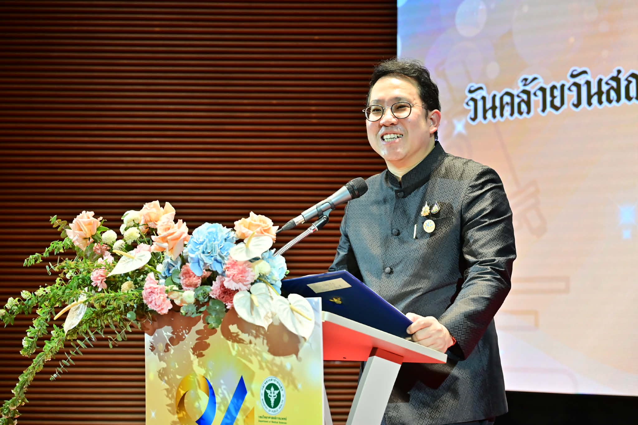 ในพิธีเปิดงานวันคล้ายวันสถาปนา กรมวิทยาศาสตร์การแพทย์ ครบรอบ 84 ปี ภายใต้หัวข้อ “From Lab to Life : Sciences for Healthy Longevity จากห้องแล็บสู่ชีวิตจริง วิทยาศาสตร์การแพทย์เพื่อการมีสุขภาพที่ยืนยาว” พร้อมมอบรางวัลแก่ข้าราชการพลเรือนดีเด่น คนดีศรีกรม และบุคลากรดีเด่น ประจำปีงบประมาณ พ.ศ. 2568 โดยมี นายยอดศักดิ์ รักษาแก้ว ที่ปรึกษารัฐมนตรีว่าการกระทรวงสาธารณสุข นางสาวจิตศ์ตราฎ์ หมีทองธนกรณ์ เลขานุการรัฐมนตรีว่าการกระทรวงสาธารณสุข ดร.นพ.สราวุฒิ บุญสุข อธิบดีกรมวิทยาศาสตร์การแพทย์ ผู้บริหาร อดีตผู้บริหารกระทรวงสาธารณสุข ภาคีเครือข่ายภาครัฐและเอกชน รวมทั้งบุคลากรกรมวิทยาศาสตร์การแพทย์จากส่วนกลางและส่วนภูมิภาคเข้าร่วมงาน ณ กรมวิทยาศาสตร์การแพทย์ จังหวัดนนทบุรี