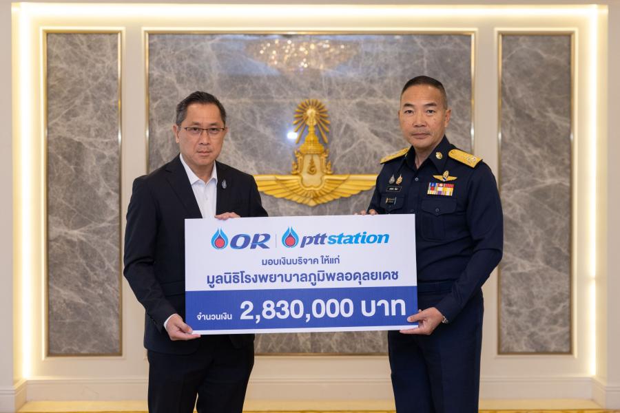 หม่อมหลวงปีกทอง ทองใหญ่ ประธานเจ้าหน้าที่บริหาร พร้อมด้วย คุณไพศาล อุดมกุลวณิชย์ รองประธานเจ้าหน้าที่บริหารด้านธุรกิจเอนเนอร์ยี่โซลูชัน บริษัท ปตท. น้ำมันและการค้าปลีก จำกัด (มหาชน) (OR) และผู้แทนจาก พีทีที สเตชั่น ร่วมมอบเงินสนับสนุนจำนวน 2830000 บาท ให้แก่ พลอากาศเอก เสกสรร คันธา ผู้บัญชาการทหารอากาศ เพื่อนำไปใช้ในการจัดซื้อเครื่องมือแพทย์สำหรับการรักษาผู้ป่วยด้านอายุรกรรม มูลนิธิโรงพยาบาลภูมิพลอดุลยเดช ซึ่งเป็นโรงพยาบาลภายใต้สังกัดกรมแพทย์ทหารอากาศ รวมถึงใช้เป็นเครื่องมือสนับสนุนการเรียนการสอน สำหรับนิสิตแพทย์ แพทย์ประจำบ้าน และแพทย์ประจำบ้านต่อยอด เพื่อเสริมศักยภาพการให้บริการทางการแพทย์ และการพัฒนาบุคลากรด้านสาธารณสุขของประเทศ