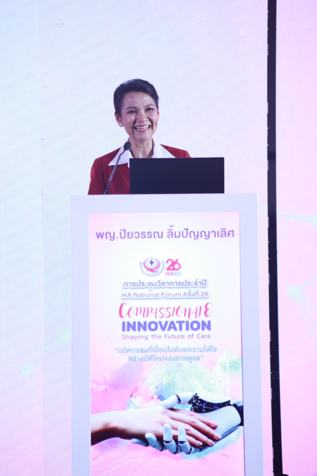 ด้าน พญ.ปิยวรรณ ลิ้มปัญญาเลิศ ผู้อำนวยการสถาบันรับรองคุณภาพสถานพยาบาล (องค์การมหาชน) หรือสรพ. กล่าวสรุป The 26th HA National Forum ว่า อยากให้พวกเราทุกคนมีแรงบันดาลใจในการกลับไปทำงานต่อ โดยนำข้อมูลการแลกเปลี่ยนเรียนรู้ครั้งนี้ไปพัฒนางานคุณภาพต่อไป ซึ่งการจัดงาน HA National Forum ครั้งที่ 26 ได้รับเกียรติจากทั้งรัฐมนตรีว่าการกระทรวงสาธารณสุข(สธ.) และรัฐมนตรีช่วยว่าการกระทรวงสาธารณสุข ปลัดกระทรวงสาธารณสุข และผู้บริหารที่เกี่ยวข้องทุกท่าน ต่างให้ความสำคัญของการพัฒนาคุณภาพ ซึ่ง "Compassionate Innovation” เป็นธีมการจัดงานปีนี้ ธีมแห่งความใส่ใจ เพื่อสร้างมิติใหม่ของการดูแลในนวัตกรรมที่เกิดขึ้น