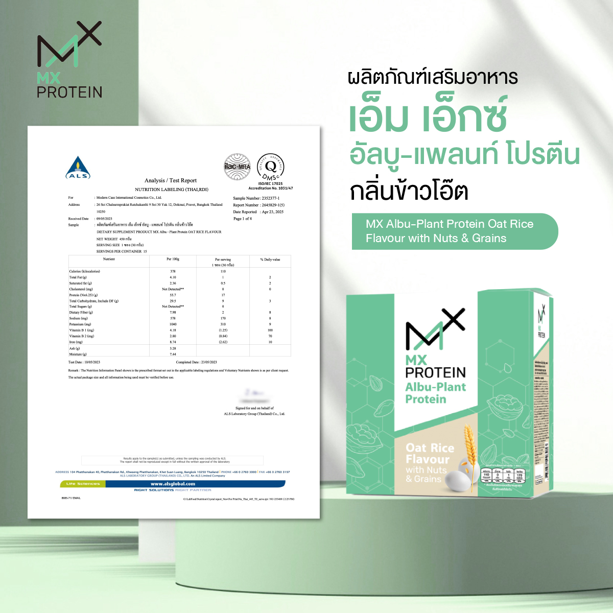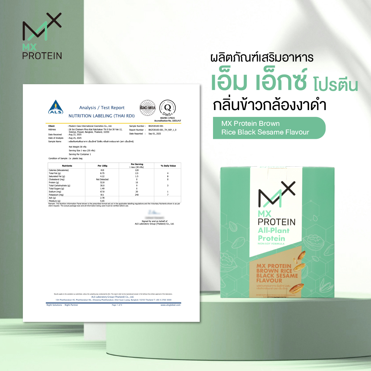 บริษัท แฮ็ปปี้ เอ็มพีเอ็ม จำกัด ผู้จัดจำหน่าย MX Protein (เอ็ม เอ็กซ์ โปรตีน) ทั้ง 2 รสชาติ ได้แก่ ผลิตภัณฑ์เสริมอาหาร เอ็มเอ็กซ์ โปรตีน กลิ่นข้าวกล้องงาดำ และผลิตภัณฑ์เสริมอาหาร เอ็ม เอ็กซ์ อัลบู-แพลนท์ โปรตีน กลิ่นข้าวโอ๊ต ขอตอกย้ำจุดยืนการเป็น “โปรตีนที่จริงใจ” เปิดเผยข้อมูลส่วนประกอบแบบหมดเปลือก พร้อมโชว์ Test Report ที่โปร่งใสทุกจุดทศนิยม เพื่อสร้างความมั่นใจและทวงคืนความเชื่อมั่นให้กับผู้บริโภคชาวไทย