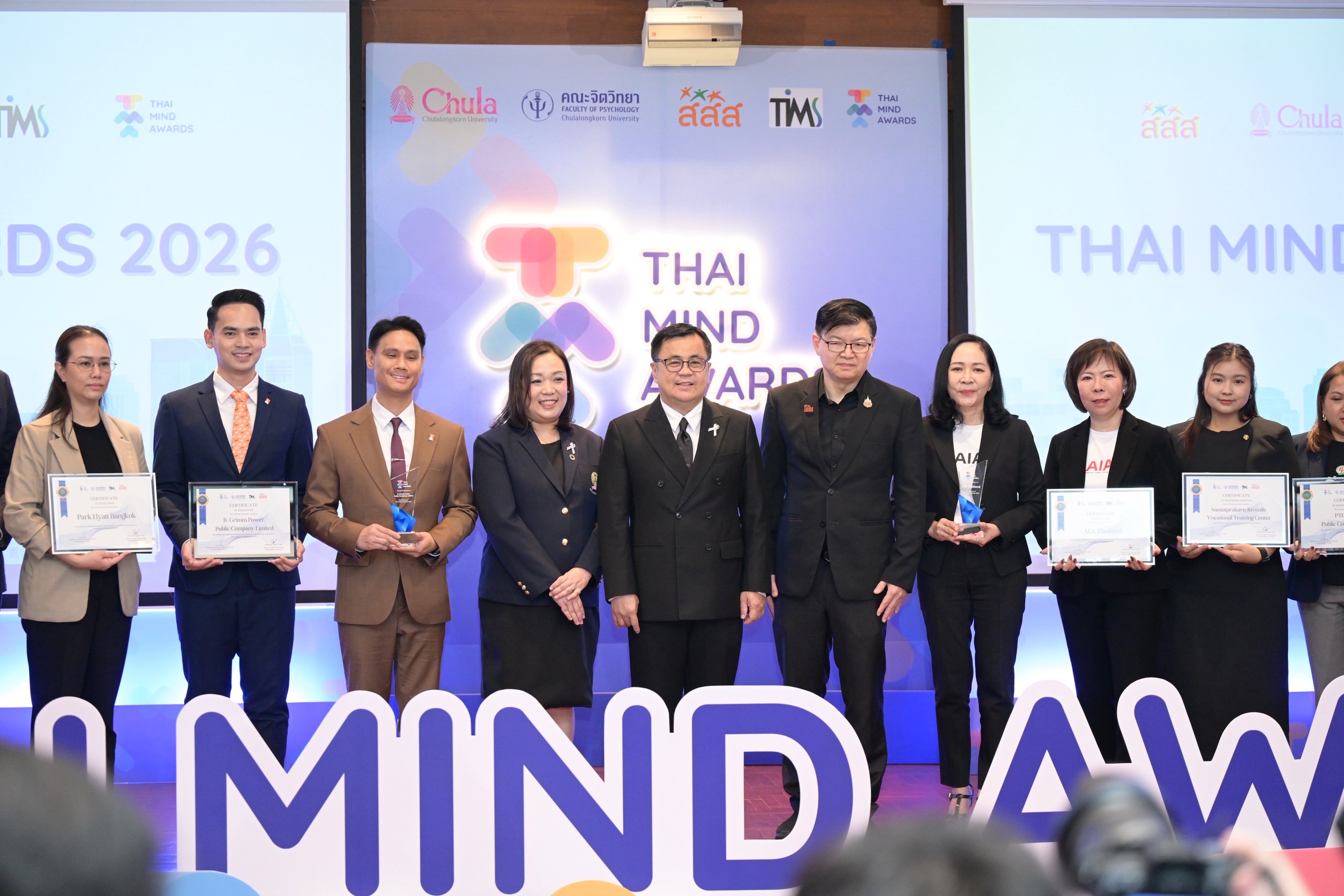 ด้าน ผศ.ดร.ณัฐสุดา เต้พันธ์ คณบดีคณะจิตวิทยา จุฬาลงกรณ์มหาวิทยาลัย กล่าวว่า โครงการ Thai Mind Awards ปีที่ 2 เปิดรับสมัครตั้งแต่เดือนต.ค. 2568 มีองค์กรสมัครเข้าร่วมกว่า 50 แห่ง ปีนี้ได้พัฒนากระบวนการคัดเลือกและการเรียนรู้ โดยใช้กรอบแนวคิด GRACE Model ที่ให้ความสำคัญในการสร้างองค์กรที่เอื้อต่อสุขภาวะ ทั้งการเติบโตของบุคลากร ความสัมพันธ์ในที่ทำงาน ความปลอดภัยทางใจ สุขภาพ และวัฒนธรรมองค์กรที่สนับสนุนการดูแลกันและกัน ที่สำคัญคือการสร้างองค์ความรู้และแนวปฏิบัติที่สามารถถ่ายทอดต่อได้ โดยองค์กรที่ได้รับรางวัล “สุดยอดองค์กรสร้างเสริมสุขภาวะทางจิต (Thai Mind Awards)” 4 องค์กร ได้แก่ 1. กลุ่มธุรกิจการเงินเกียรตินาคินภัทร 2. AIA ประเทศไทย 3. บริษัท B. Grimm Power จำกัด (มหาชน) 4. โรงแรม Park Hyatt Bangkok และ รางวัล “ความโดดเด่นด้านการส่งเสริมสุขภาวะตามแต่ละมิติของ GRACE Model (Honorable Mention)” 5 องค์กร ได้แก่ 1. การไฟฟ้าส่วนภูมิภาค ในมิติของ Growth and Development 2. บริษัท โตโยตา มอเตอร์ ประเทศไทย (จำกัด) ในมิติของ Care for Health and Safety และ All for Inclusion 3. บริษัท แพนโดรา โปรดัคชั่น จำกัด ในมิติของ Care for Health and Safety 4. บริษัท พีทีจี เอ็นเนอยี จำกัด (มหาชน) ในมิติของ The Good Initiative for GRACE Model 5. ศูนย์ฝึกและอบรมเด็กและเยาวชนสมุทรปราการ ในมิติของ Care for Health and Safety