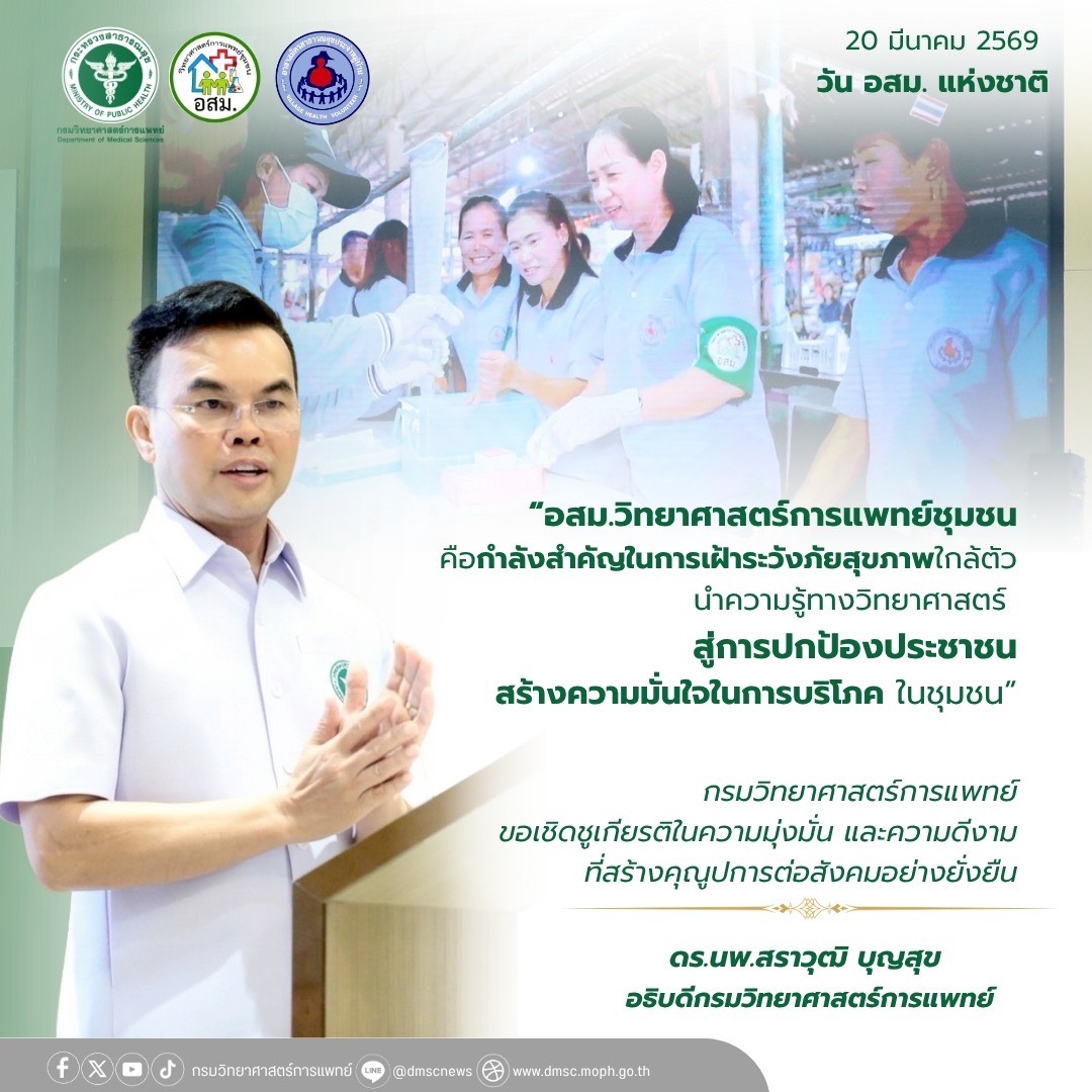 ดร.นพ.สราวุฒิ บุญสุข อธิบดีกรมวิทยาศาสตร์การแพทย์ กล่าวว่า คณะรัฐมนตรีได้มีมติให้วันที่ 20 มีนาคมของทุกปี เป็นวันอาสาสมัครสาธารณสุขแห่งชาติ และในปีนี้กระทรวงสาธารณสุขได้จัดงาน วัน อสม. แห่งชาติ ขึ้น เพื่อมอบรางวัลยกย่อง เชิดชูเกียรติ สร้างขวัญกำลังใจให้ อสม. ที่เสียสละแรงกาย แรงใจดูแลสุขภาพของประชาชนจนเป็นที่ยอมรับในระดับสากล โดยมีนายอนุทิน ชาญวีรกูล นายกรัฐมนตรี เป็นประธานเปิดงานและมอบรางวัล อสม.ดีเด่น ระดับชาติ ประจำปี พ.ศ. 2569 จำนวนทั้งสิ้น 18 สาขา และสาขาวิทยาศาสตร์การแพทย์ชุมชน เป็น 1 ในนั้น โดยกรมวิทยาศาสตร์การแพทย์ ได้คัดเลือก อสม. ที่ผ่านการอบรมตามหลักสูตร ให้เป็น อสม.วิทยาศาสตร์การแพทย์ชุมชน หรือ อสม.นักวิทย์ฯ เพื่อสนับสนุนงานเฝ้าระวัง ป้องกัน และส่งเสริมสุขภาพ ด้วยองค์ความรู้และเทคโนโลยีด้านวิทยาศาสตร์การแพทย์ โดยมีปลอกแขนสีเขียวติดแขนซ้าย เป็นสัญลักษณ์ บ่งชี้การรับรองคุณภาพการปฏิบัติงานของ อสม. ที่มีความรู้เกี่ยวกับอันตรายจากการบริโภคผลิตภัณฑ์สุขภาพที่ไม่ปลอดภัย และมีความชำนาญการในการใช้ชุดทดสอบเบื้องต้น (Test kit) ในการคัดกรองและตรวจสอบความปลอดภัยผลิตภัณฑ์สุขภาพ ทั้งด้านยาจากสมุนไพร ผลิตภัณฑ์เสริมอาหาร เครื่องสำอาง และด้านอาหาร ได้อย่างถูกต้องและเหมาะสม ปัจจุบันมี อสม.วิทยาศาสตร์การแพทย์ชุมชน กระจายอยู่ในทุกจังหวัดทั่วประเทศ จำนวน 43083 คน