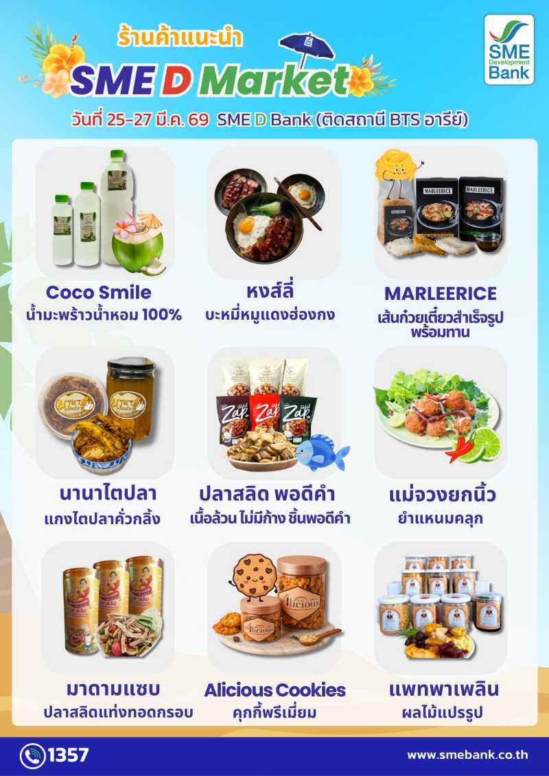 ธนาคารพัฒนาวิสาหกิจขนาดกลางและขนาดย่อมแห่งประเทศไทย (ธพว.) หรือ SME D Bank ขอเชิญชวนประชาชน ร่วมซื้อหาสินค้าดีจากผู้ประกอบการเอสเอ็มอีไทยทั่วประเทศ กระตุ้นเศรษฐกิจให้สุดคึกคัก ต้อนรับฤดูร้อนกับงาน “SME D Market” ประจำเดือนมีนาคม 2569 จัดระหว่างวันที่ 25-27 มีนาคม 2569 ณ หน้าอาคาร และชั้น 1 อาคาร SME Bank Tower (ติดรถไฟฟ้า BTS สถานีอารีย์) พบกับสินค้าอุปโภคบริโภค อาหาร เครื่องดื่ม และผลิตภัณฑ์คุณภาพหลากหลายประเภท ที่รวบรวมสินค้ามาไว้ครบในจุดเดียวมากกว่า 50 ร้านค้า
