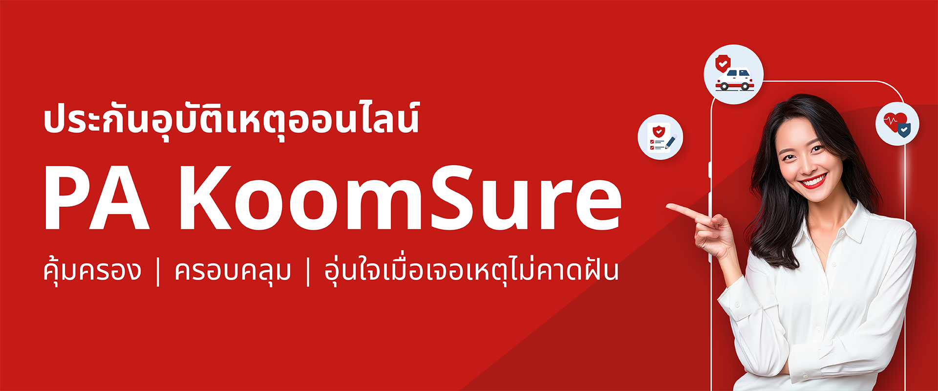 · PA Koom Sure (พีเอ คุ้ม ชัวร์) ประกันอุบัติเหตุ ค่าเบี้ยเริ่มต้นเพียงวันละ 5 บาท ให้ความคุ้มครองการเสียชีวิตจากอุบัติเหตุสูงสุด 1 ล้านบาท พร้อมความคุ้มครองค่ารักษาพยาบาลจากอุบัติเหตุ การขับขี่หรือโดยสารจักรยานยนต์ กระดูกแตกหักเสียหาย และรวมถึงการชดเชยรายได้ในกรณีเข้ารักษาใน ICU
