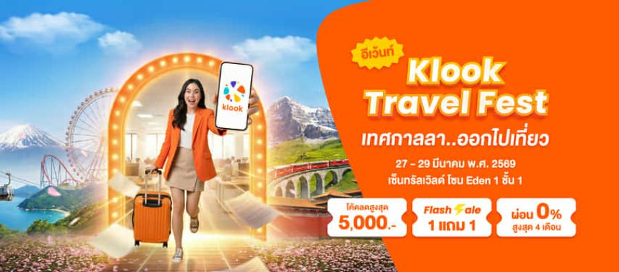 เพื่อรองรับความต้องการด้านการท่องเที่ยวที่เพิ่มสูงขึ้น Klook เตรียมจัดงานมหกรรมท่องเที่ยวประจำปี “Klook Travel Fest: เทศกาลลา…ออกไปเที่ยว” ระหว่างวันที่ 27–29 มีนาคม 2569 ณ ศูนย์การค้า CentralWorld โซน Eden 1 ชั้น 1 รวมดีลท่องเที่ยวสุดคุ้มเพื่อต้อนรับช่วงเทศกาลสงกรานต์