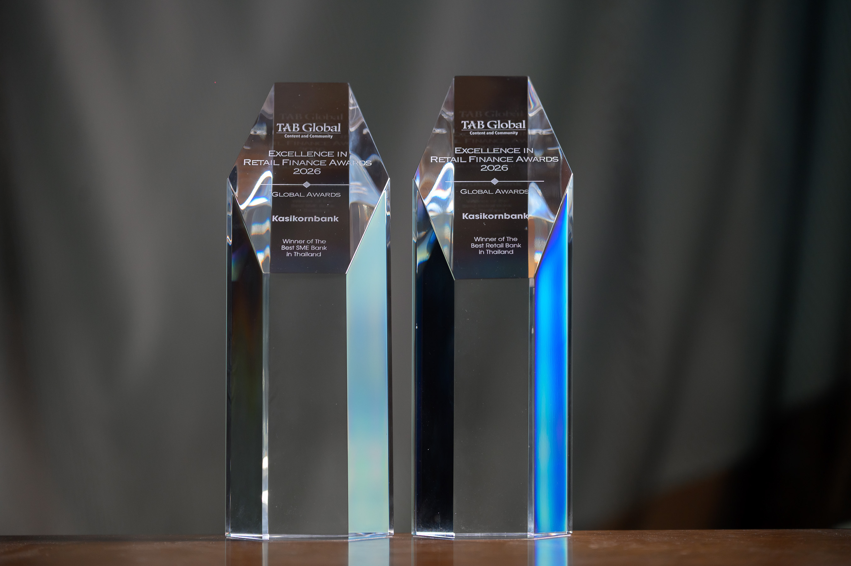 ล่าสุดธนาคารได้รับ 2 รางวัลจากเวทีระดับโลก The Asian Banker (TAB) Global Excellence in Retail Finance Awards 2026 ในสาขารางวัลธนาคารยอดเยี่ยมกลุ่มลูกค้ารายย่อย (Best Retail Bank in Thailand 2026) ต่อเนื่องเป็นปีที่ 17 จากความโดดเด่นในการพัฒนาบริการที่ตอบโจทย์และช่วยยกระดับประสบการณ์การใช้บริการให้กับลูกค้า ซึ่งสะท้อนความเป็นผู้นำด้านดิจิทัลและนวัตกรรมทางการเงิน และรางวัลธนาคารยอดเยี่ยมกลุ่มผู้ประกอบการ SME (Best SME Bank in Thailand 2026) ตอกย้ำความเป็นผู้นำในการสนับสนุนผู้ประกอบการ SME ด้วยโซลูชันทางการเงินที่ครบวงจร และตอบโจทย์การเติบโตอย่างยั่งยืน ซึ่งรางวัลพิจารณาโดยคณะกรรมการผู้ทรงคุณวุฒิระดับนานาชาติ ผ่านเกณฑ์การประเมินที่เข้มข้น ครอบคลุมทั้งผลการดำเนินงาน นวัตกรรม และศักยภาพด้านดิจิทัล สะท้อนมาตรฐานระดับโลกของสถาบันการเงินชั้นนำ ธนาคารกสิกรไทยมุ่งมั่นพัฒนานวัตกรรมทางการเงินอย่างต่อเนื่อง เพื่อสร้างคุณค่าให้ลูกค้าทั้งรายย่อยและ SME ซึ่งเป็นรากฐานสำคัญของเศรษฐกิจไทย พร้อมยกระดับประสบการณ์ลูกค้า และสร้างโอกาสใหม่ทางธุรกิจ สู่การขับเคลื่อนเศรษฐกิจไทยให้เติบโตอย่างยั่งยืนต่อไป