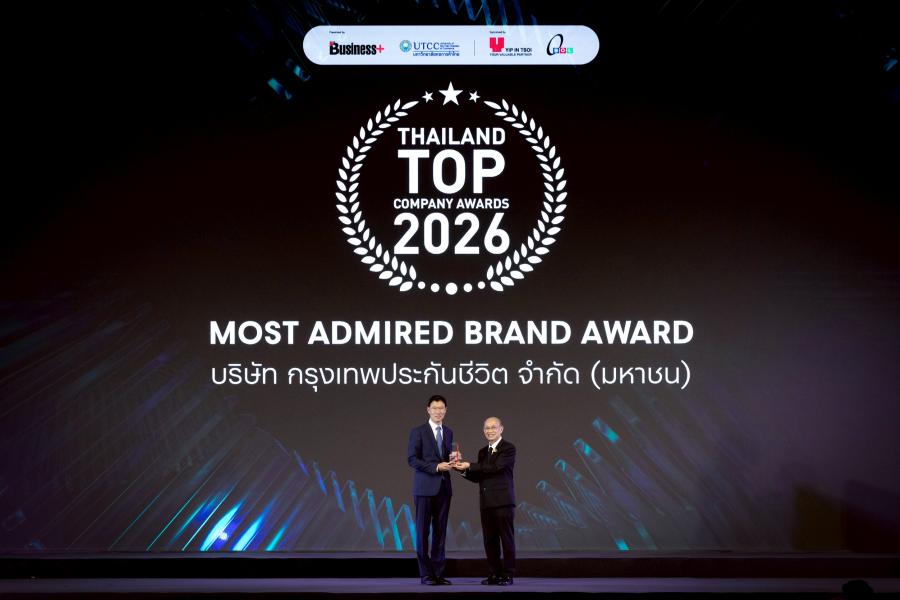 กรุงเทพประกันชีวิต ประสบความสำเร็จอย่างต่อเนื่องจากการคว้ารางวัลที่สะท้อนความ “ใส่ใจ” โดยยังคงครองตำแหน่ง “สุดยอดแบรนด์ที่ครองใจผู้บริโภค” หรือ Most Admired Brand Award 2026 เป็นปีที่ 3 จากเวทีประกาศรางวัล Thailand Top Company Awards 2026 จัดโดยนิตยสาร BUSINESS ร่วมกับมหาวิทยาลัยหอการค้าไทย โดยมี นายโชน โสภณพนิช กรรมการผู้จัดการใหญ่และประธานเจ้าหน้าที่บริหาร บริษัท กรุงเทพประกันชีวิต จำกัด (มหาชน) เป็นผู้รับรางวัลจาก ศาสตราจารย์เกียรติคุณ นพ.เกษม วัฒนชัย องคมนตรี เป็นประธานในพิธีมอบรางวัล โดยมีผู้บริหารระดับสูงร่วมแสดงความยินดี ณ ห้องบอลรูม โรงแรมอินเตอร์คอนติเนนตัล กรุงเทพฯ เมื่อเร็วๆ นี้